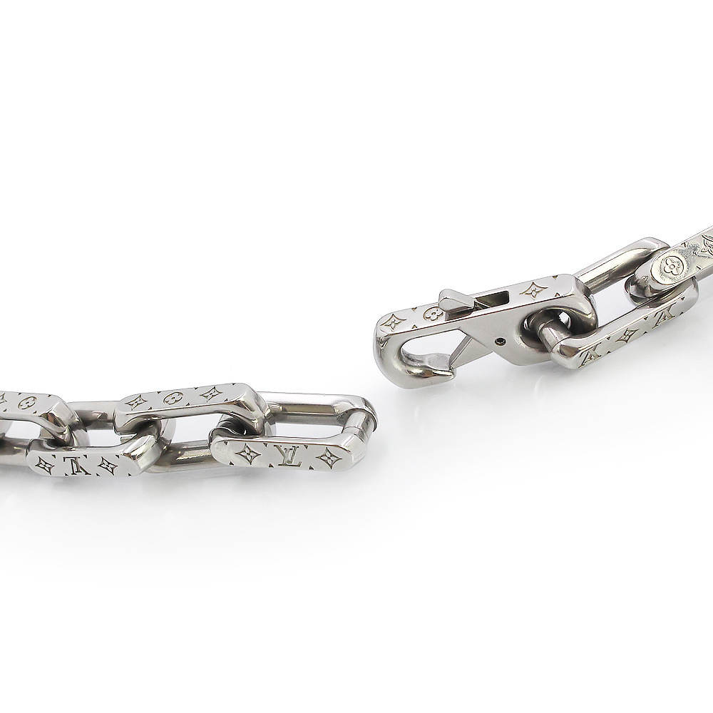 シグネチャーのモチーフを精巧に刻印した、アイコニックな「ネックレス・チェーン モノグラム」。シルバーカラーのメタルで象ったチェーンに、ルイ・ヴィトンを象徴するモノグラム・パターンがデザインされています。