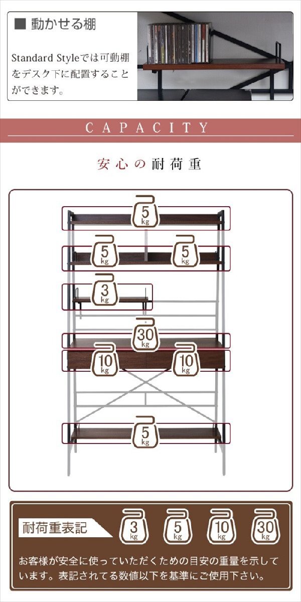 | [上部収納棚]5kg以下 [天板]30kg以下 [引き出し]10kg以下/杯 [可動棚]3kg以下 [下棚]5kg以下 |