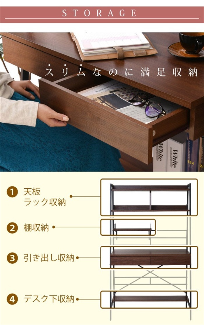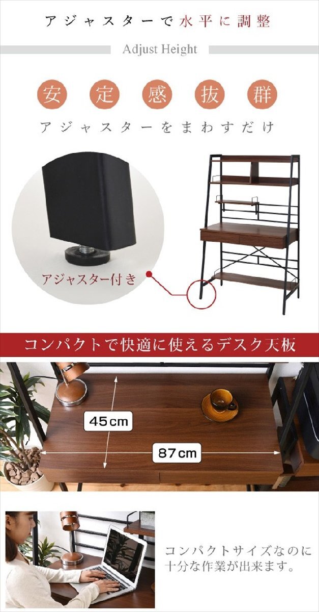 | □外寸 幅91×奥行48×高さ150cm □内寸 [上部収納上オープン部]幅87×奥行20×高さ5cm [上部収納左右オープン部]幅40.5×奥行24×高さ21cm [上部収納棚下空間高さ]スタンダード時45、フロア時75.5cm [デスク面]幅87×奥行45×高さ(スタンダード時)73(フロア時)42.5cm [デスク下空間]幅87×奥行45×高さ(スタンダード時)59.5(フロア時)29cm [引き出し左右]幅35.5×奥行33.5×高さ4.5(有効6.5)cm [可動棚]幅40.5×奥行15×厚み1.8cm [下棚]幅83×奥行20×厚み1.8cm |