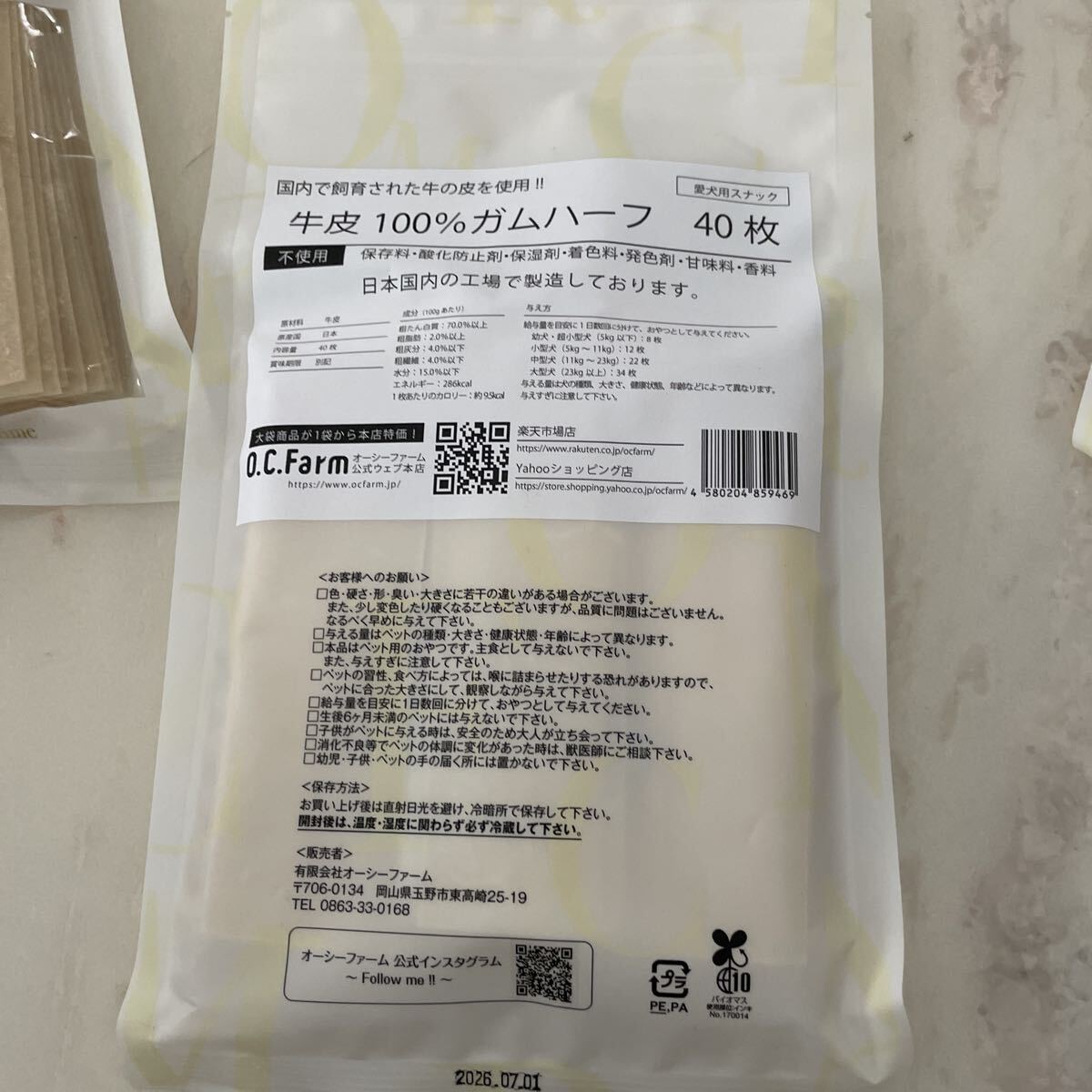 牛皮100%使用のバームハーフ、40枚入りで犬のおやつに最適。