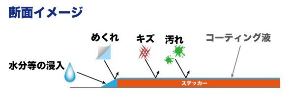 貼付け後のステッカーに塗布することで、擦過や洗浄によるステッカーの剥がれが起こりにくくなります。