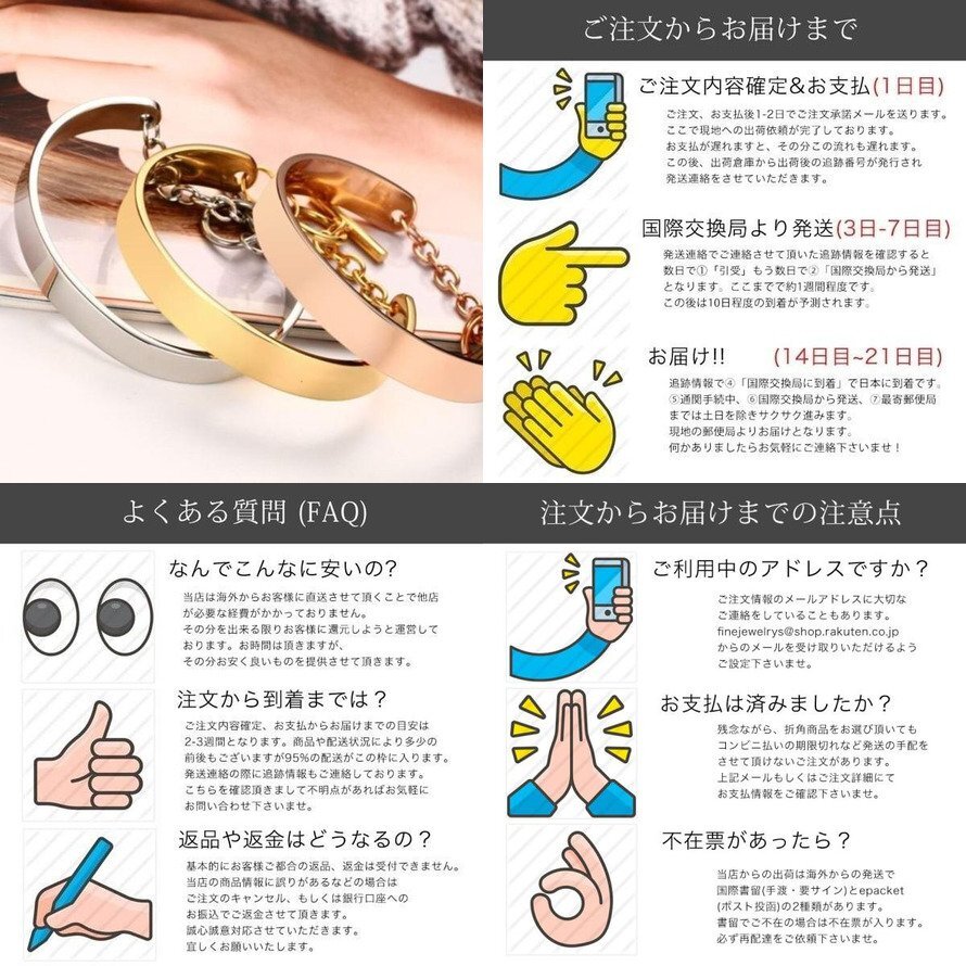 <font size=2>当店のお品物は</font><font size=4 color=red>全品送料無料</font><font size=2>でお届けしております! 本商品は海外からの直送品となります。お安くご提供するため、商品発送から到着までに<font size=4 color=red>2-3週間程度</font>お時間を頂戴しております。航空便の状況によっては到着までに1ヶ月程度必要とする場合もございますので予めご了承ください。 基本的に追跡情報ありの国際郵便かeパケットでの配送となります。配送中のご質問もお問い合わせをいただければ都度確認しご連絡差し上げますので、ご安心くださいませ。</font> |