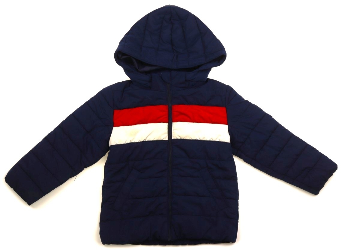 表地・中綿・裏地はすべてポリエステル素材。フードの取り外しが可能です。アイボリー部分に複数の汚れあり。袖に白く細かい毛羽の付着あり。全体に薄汚れがありますが、普段使いにいかがでしょうか。
