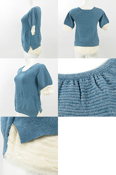 ナチュラル&ガーリーな重ね着風異素材MIXニット☆ 優しい雰囲気の杢ブルーのニットの後ろ側の裾に、 シャリ感のある切りっ放しのシルクのティアードフリルが ふわふわと揺れるバックシャンなデザインです。 袖口を絞ったシャーリングのシフォンもフェミニン♪ アームホールに若干の毛羽立ちがございます。 実寸 着丈(前身ごろ約42cm;後ろ身頃約55cm) ゆき丈約93cm バスト約80cm 【サイズ】:(2) 【素 材】:(本体部分 ナイロン52% レーヨン34% 毛14% 別布部分 絹100%) 【 色 】:(青・白) 【程 度】:(AB) 管理番号 27131118-122 499 019 | ||||