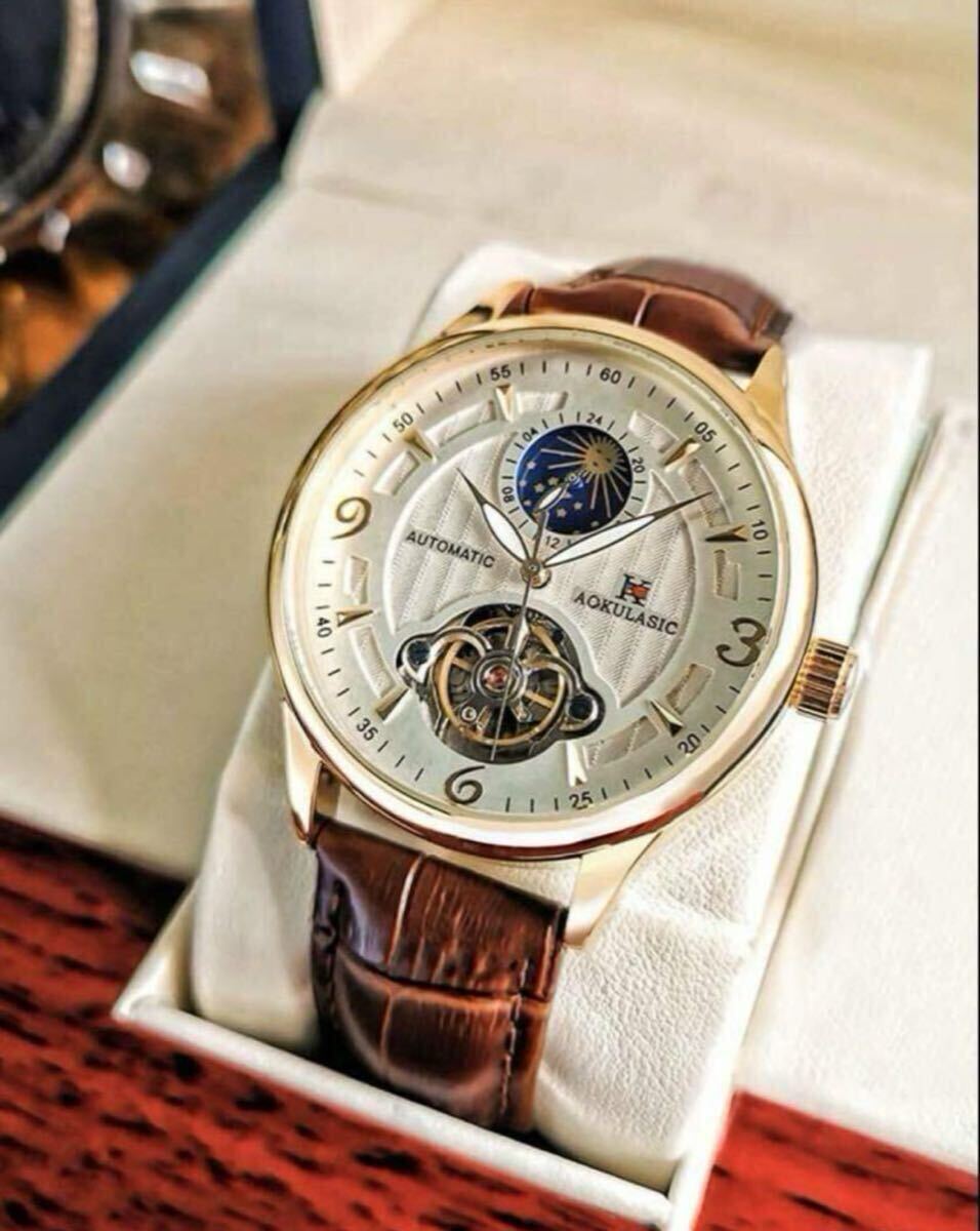 トゥールビヨン機構を備えた自動巻き時計、ホワイトダイヤルとゴールドケースの洗練されたデザイン。