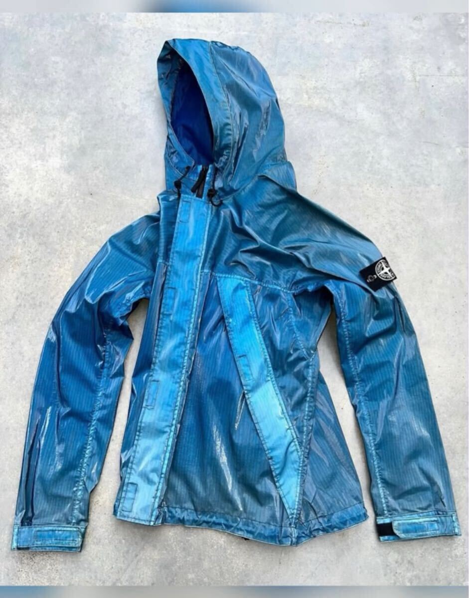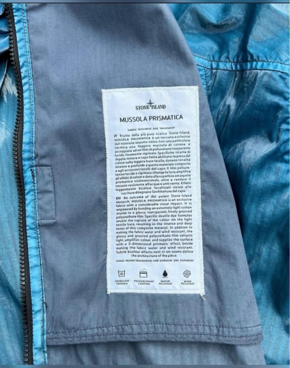 徹底した研究から生まれた「Mussola Prismatica」は卓越したビジュアルインパクトを持った、他に類を見ない生地。光沢を持った透明な微粒子状ポリウレタンフィルムを、特殊な技術を用いてプリントした軽量のコットンモスリンにラミネート加工。特殊な二重のガーメントダイの技術によって、ポリウレタンフィルムが光を反射することで、カラーエフェクトを増進させ、生地になめらかで立体的な表情を作り出した。