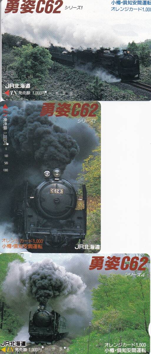 使用済オレンジカード JR北海道 雄姿C62シリーズ1、2,4 1000円券3枚組 説明文参照