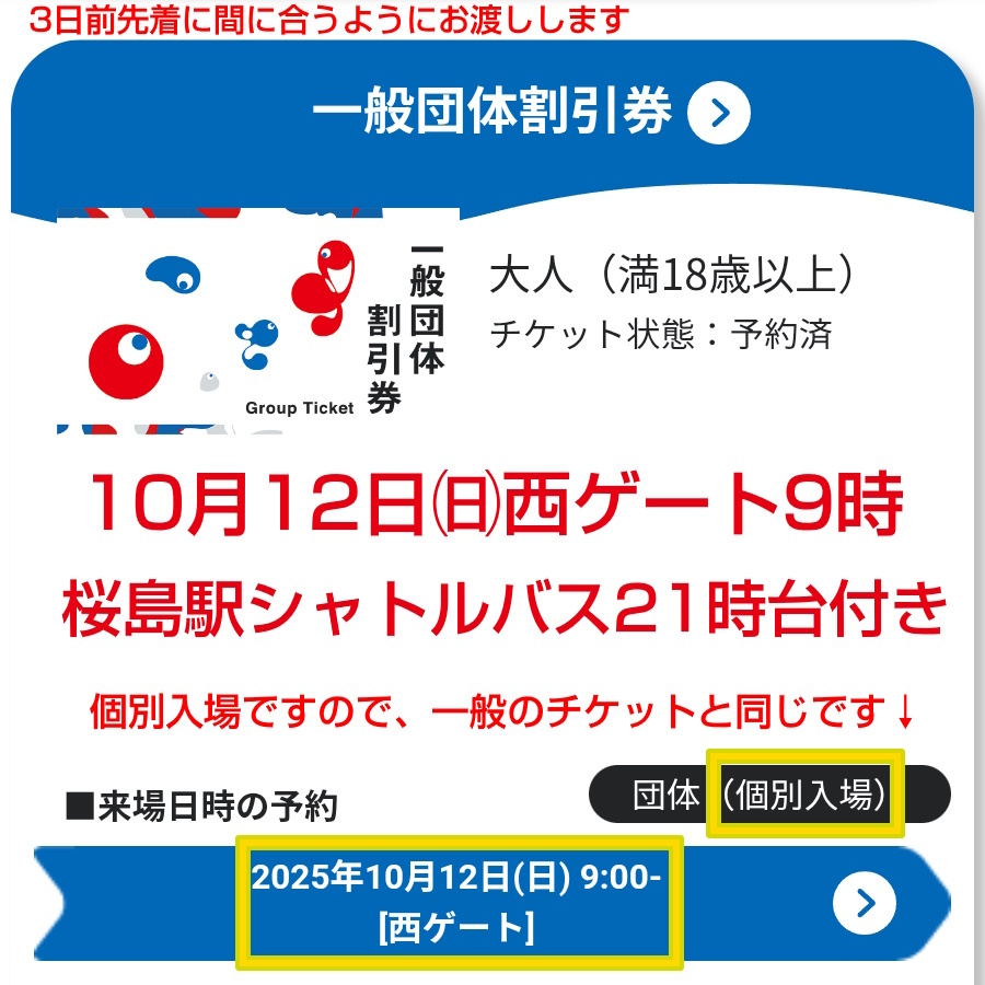 EXPO2025 大阪 関西 万博 入場チケット 予約済 10月12日 10/12 9時 西ゲート 大人 1枚 桜島駅 シャトルバス 21時