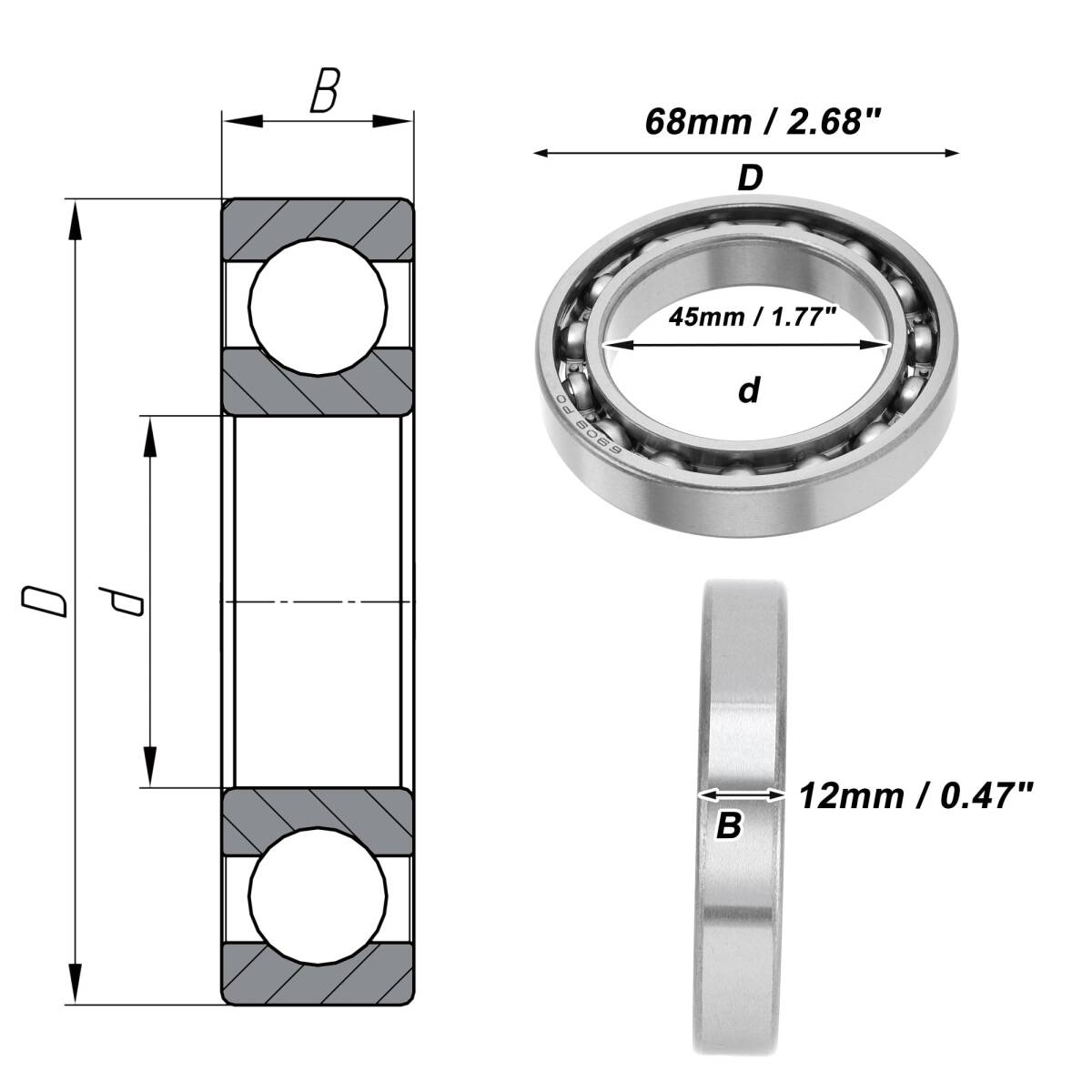 仕様:外径: 68mm / 2.68インチ、内径: 45mm / 1.77インチ、幅: 12mm / 0.47インチ、タイプ: 6909、精度レベル: P0、基本荷重評価 (kN): Cr:14.1 C0r:10.9、限界速度(min-1): グリース:9500 オイル:12000