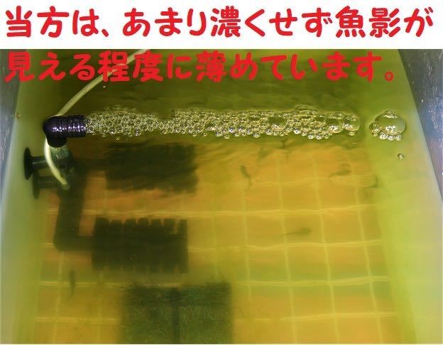 》》》水槽の神水《《《 ・グリーンウォーターとは名前の通り緑色の水で、植物性プランクトンが水中に大量に発生した事によって水が緑色に変色した物です。 ・メダカや金魚を飼育する上で最適の環境になり、稚魚に使用する事で生存率も格段に上がります。 ・稚魚は食欲旺盛ですが、一度に食べられる量が少なく口も小さいので人口餌だと一日に数回与えなくてはならず、また適量が判らず与えすぎによる水質の悪化でせっかく生まれた稚魚が落ちてしまう原因にもなります。 ・針子や稚魚をグリーンウォーターの中で育てると餌となる植物性プランクトンを食べたい時に食べられるので生存率も上がり、健康面・発育にも良く一石二鳥・三鳥です。 (主食ではありませんのでゾウリムシや人口餌等、主食になる物を適量お与え下さい) ★★★越冬の為に秋の内にグリーンウォーターを作っておいた方が良いと思います。 ・何故越冬にグリーンウォーターが良いのか? ・水の酸化が抑えられ、越冬中は基本的に換水しないのでそう考えると越冬には最適の飼育水だと思います。 ・グリーンウォーターは基本的に水あたりも少なく魚には優しい飼育水です。 【セット内容】 グリーンウォーター900ml 培養液肥 20ml ・当商品は、かなり濃い目に仕上げております。 液肥 20mlもサービスで付けておりますので、到着後すぐに培養する事が出来ます。 ※種水1.8リットルに対してカルキ抜きをした水約10リットル程度で、液肥を5~10ml使用します。 ※濃く仕上げたい場合は1週間程度経過後、濃くなってきましたら液肥を更に5~10ml追加し納得の濃さに仕上げて下さい。 (液肥の割合は個人差がありますが当方が妥当だと思う割合になります。) ※今の時期ですと4日~1週間前後で濃く仕上がります。(割水は飼育水を1/4程は混ぜて下さい。) ※液肥は培養する際にご使用ください。直接水槽には入れないで下さい。 ・当商品のグリーンウォーターは、もちろん飼育水に割って使用する事も出来ます。 ※すべて自己責任の上行って下さい。 ※グリーンウォーターは飼育する上での補助的なものです。主食として餌は必ず与える様にして下さい。 ※真空パック用の厚みのある袋に2重にして保冷バッグに入れて送らせて頂きます。 ※実際の色は撮影の状況・PCの環境により多少異なる場合があります。 ∽∽∽ 注意事項 ∽∽∽ ☆ご購入後、48時間以内のご連絡・72時間以内のお支払い手続きを頂けます様にお願い致します。 ※受け取り連絡は速やかにお願い致します。 ☆上記事項を納得の上、ご入札下さい。 ★★★尚、ご新規様のいたずら入札が見受けられますので落札された場合はオークション終了後、12時間以内にご連絡頂けます様にお願い致します。 (ご連絡頂けなかった場合は落札者都合で削除致します。その際は、本意ではございませんがシステム上“非常に悪い”が付きますので予め御了承下さい。) ☆ご質問等ございましたらお気軽にお尋ね下さい。 ※終了日当日及び直前のご質問に関しては時間の都合上、お答え出来ない場合がございます。 | |||