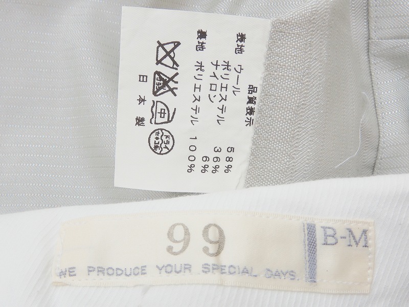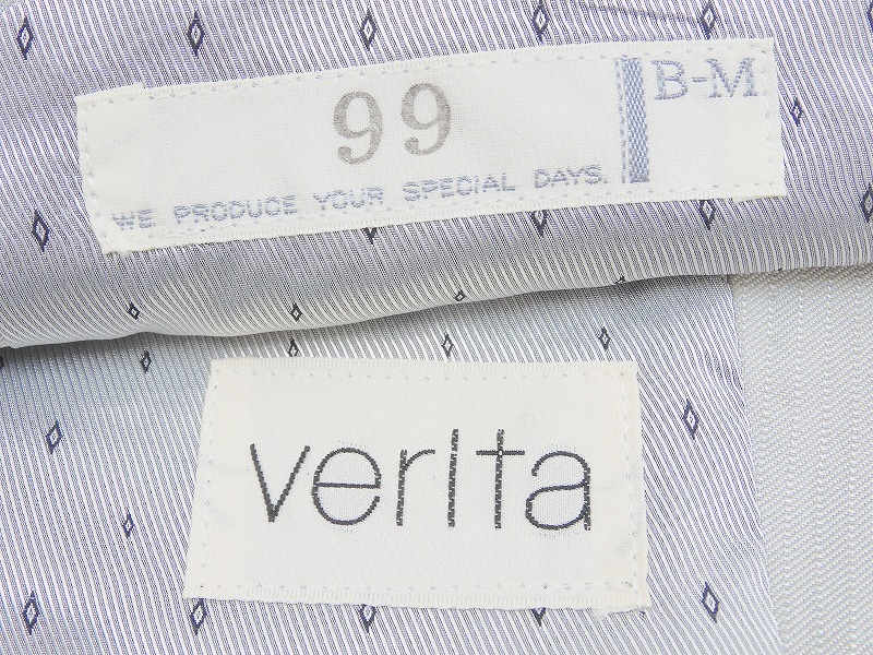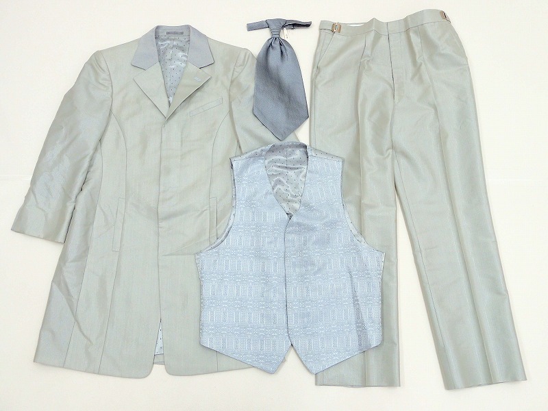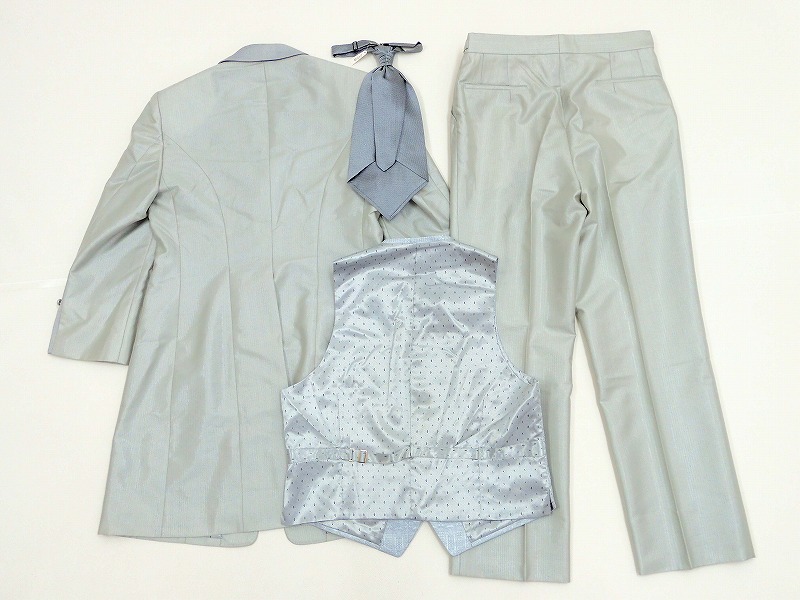 ◆タキシード/verita/グレー/スリーピース/ネクタイ付/BM/結婚式等に/(梱包サイズ:80)◆* コメント・全体的に薄汚れ・シワがあります。 ・中古品ですので、ご理解のある方のご入札をお願い致します。 ・ ・ ・ * 品質・サイズ -- 着物サイズ目安 -- ・ジャケット 肩幅・約46cm、脇下身幅・約52cm、着丈・約96cm、袖丈・約59cm ベスト 肩幅・約32.5cm、脇下身幅・約54cm、着丈・約53.5cm パンツ ウエスト約80~98cm(アジャスター付)、ズボン丈・約101cm、股下・約75cm ・グレー ・ ・※一部商品のみのお取引はお断り致しております。入札前・落札後に一部の商品のみのお取引交渉や発送方法(メール便等利用)の交渉はご遠慮下さい。サイズ・発送詳細を必ずご確認のうえ、ご理解・ご納得のうえでのご入札をお願い致します。 ・梱包サイズ:80サイズ(発送詳細必読) * 程度 当社基準ランク・・・【4】