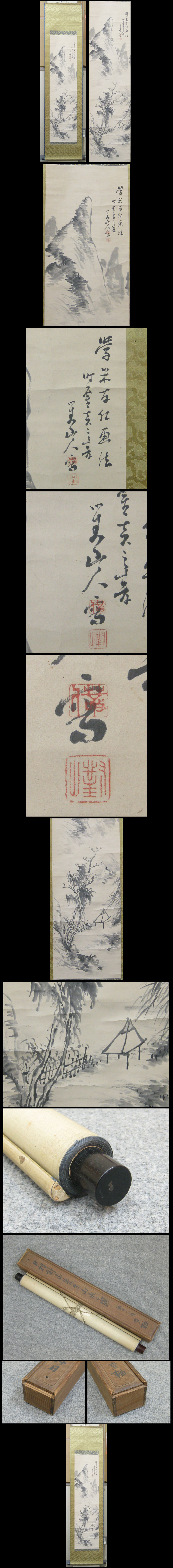 【日根対山】 江戸後期の南画家。和泉国日根郡中庄村湊生。名は盛長。字は成信、小年。 別号に茅海、錦林子、酔墨庵など。幼少より画を好み、 はじめ岸和田で土佐派の桃田栄雲に学び、 また幼馴染であった泉佐野の豪商里井浮丘の縁で大坂に出て岡田半江に南画を学ぶ。 のち京都に移り貫名菘翁に師事した。鉄翁祖門に私淑し、主に山水画を得意とする。 明治2年(1869)歿、57歳。 ★商品サイズ★ ■掛軸 187×45.5cm ■作品 126×32.5cm ★商品の状態★ 真贋が不明なので模写として出品いたします。 作品に少しのしみ汚れ、折れ皺があります。 表具に少しのしみ汚れがあります。 箱に欠損部分があります。 ご承知のうえご入札をお願いします。 時代など詳しくは画像にてよく確認のうえでご検討いただければと思います。 どうぞよろしくお願いいたします。 |