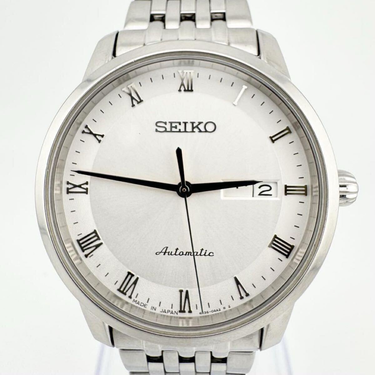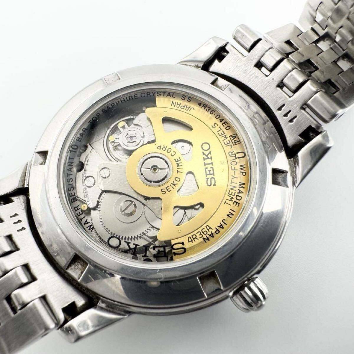 美品 SEIKO PRESAGE セイコー プレザージュ メカニカル ベーシックライン 裏スケ デイデイト 4R36-04E0 シルバー文字盤 青針 メンズ 自動巻き 腕時計
