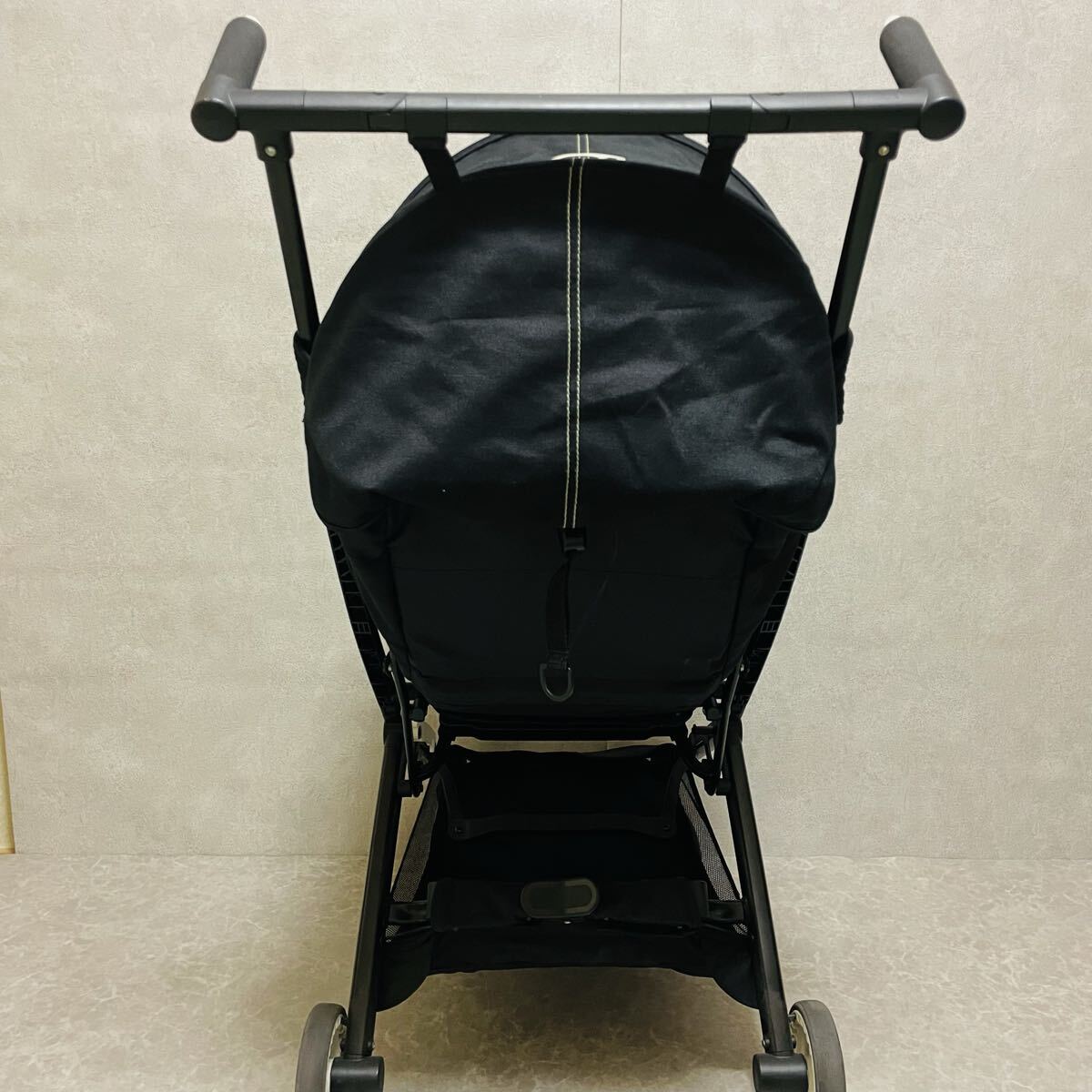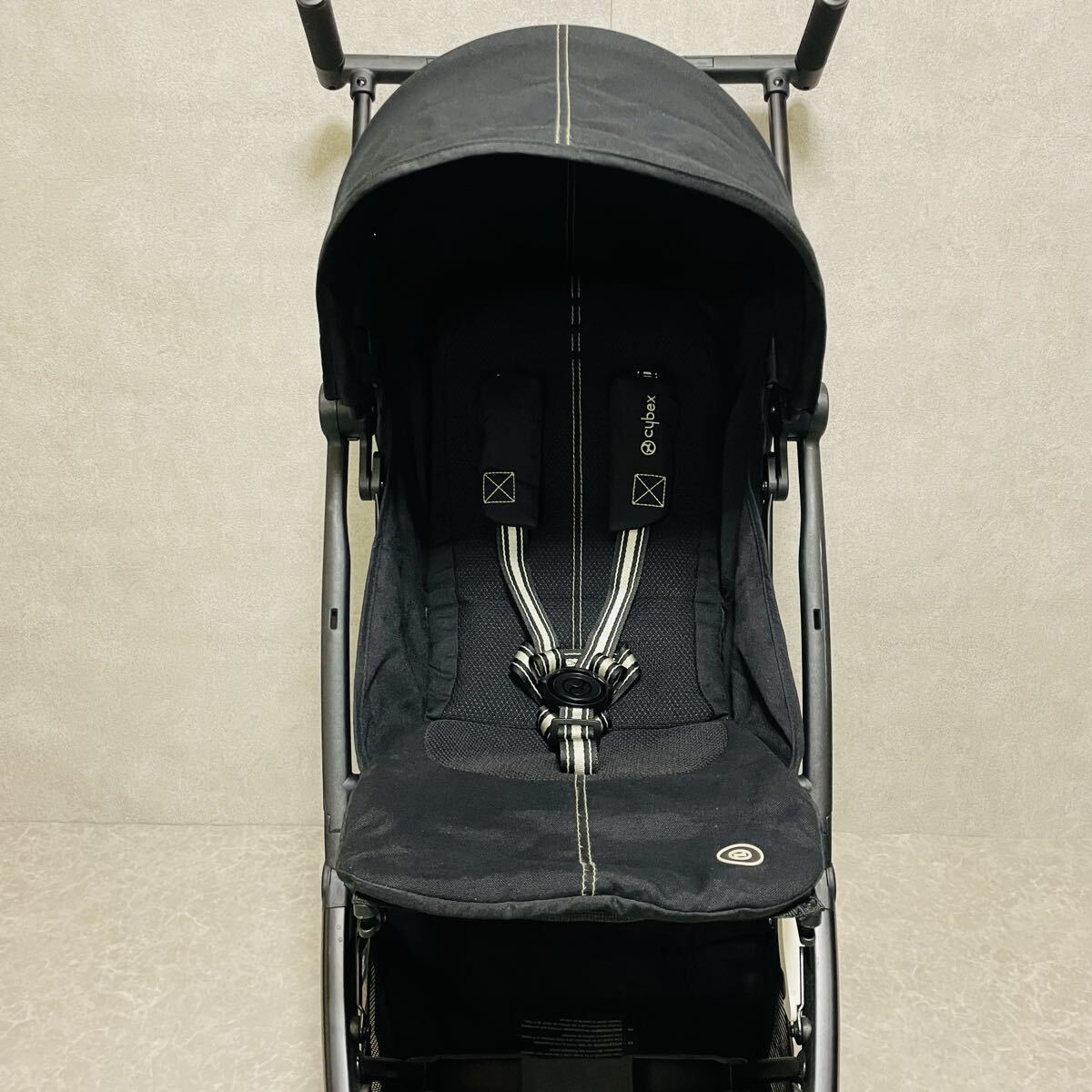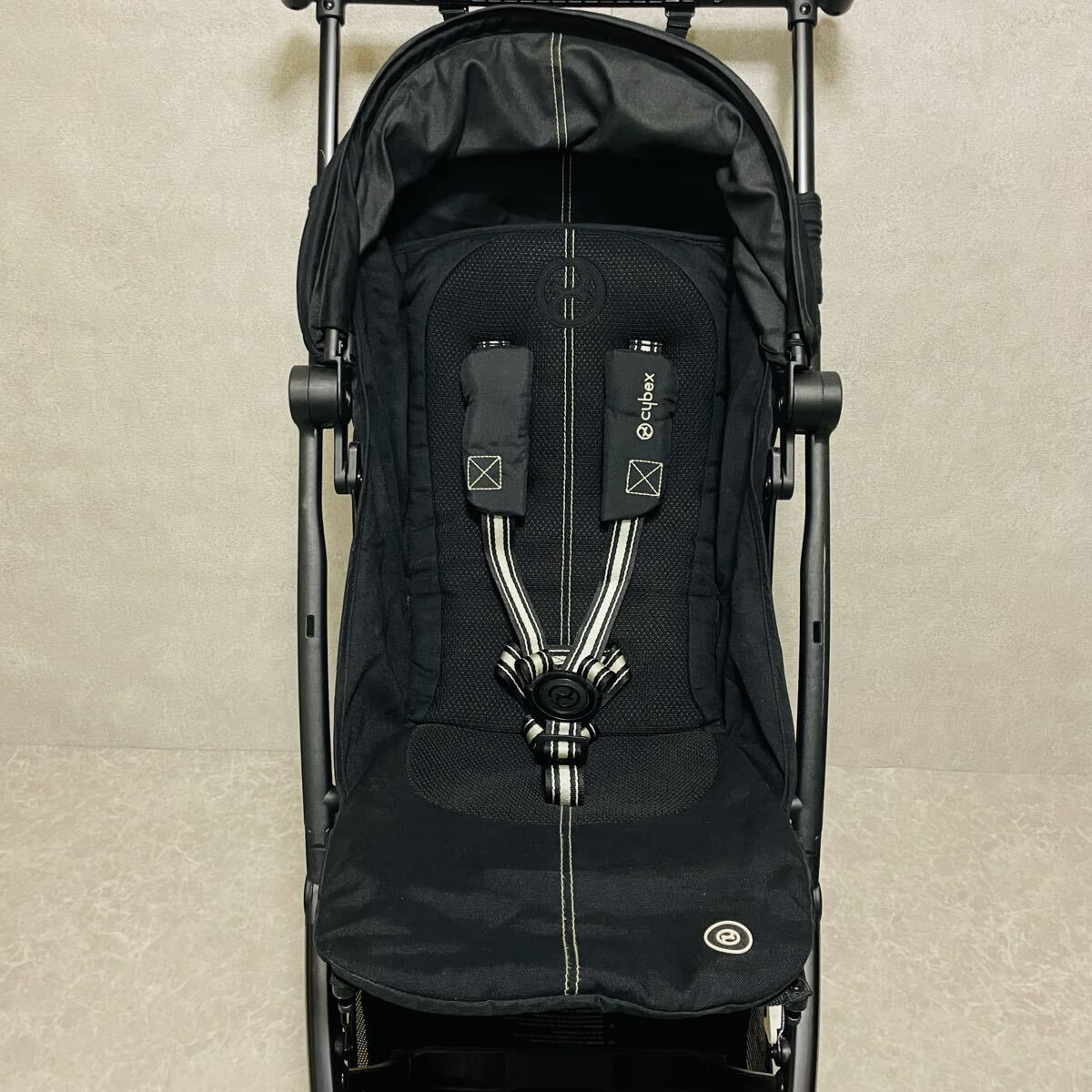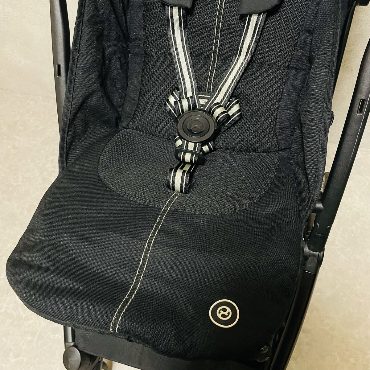 ムーンブラックのコンパクトベビーカー、5点式ハーネス付きで安全性が高い。