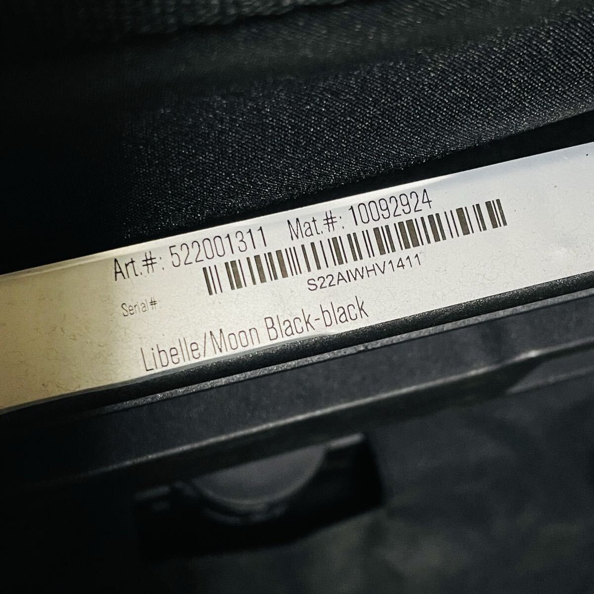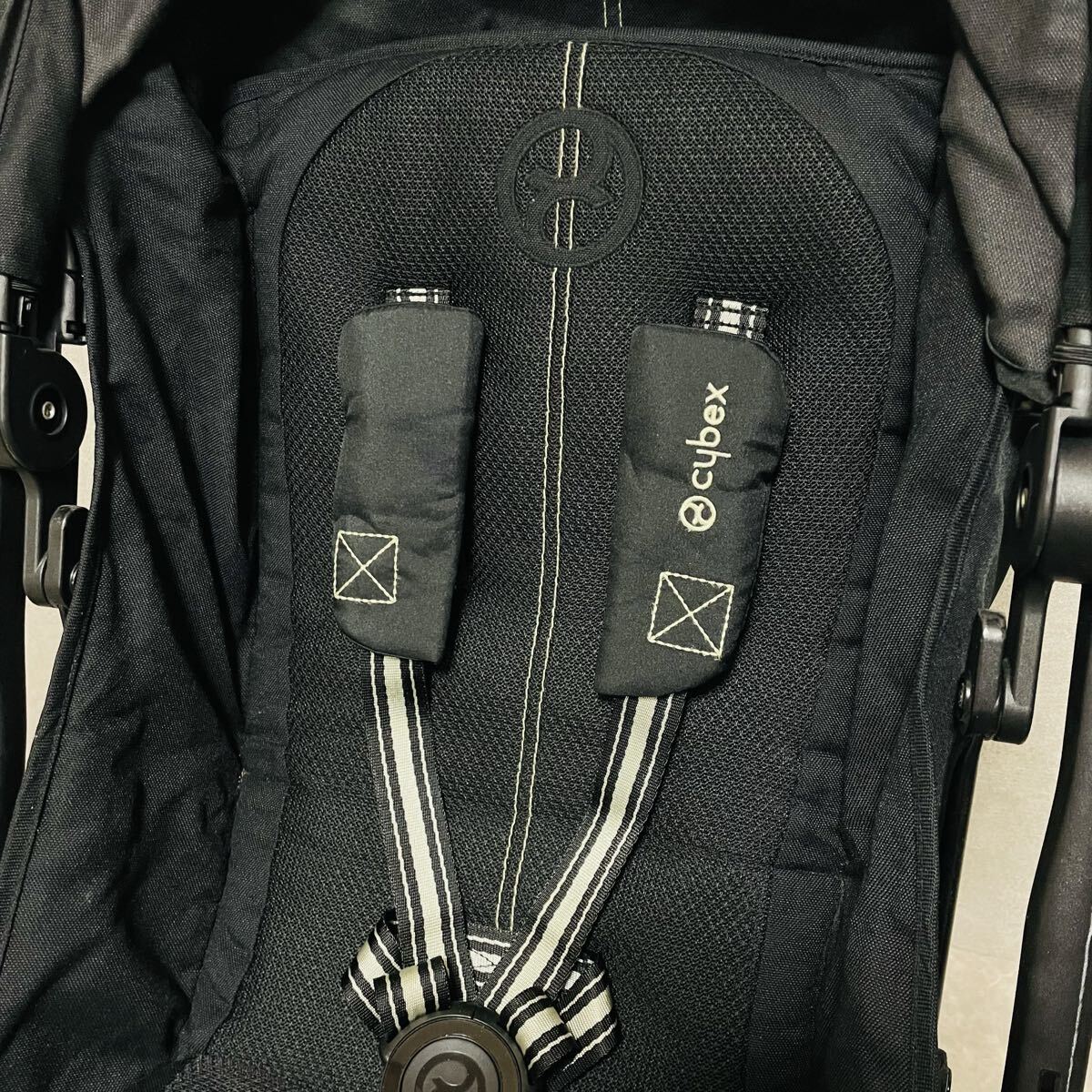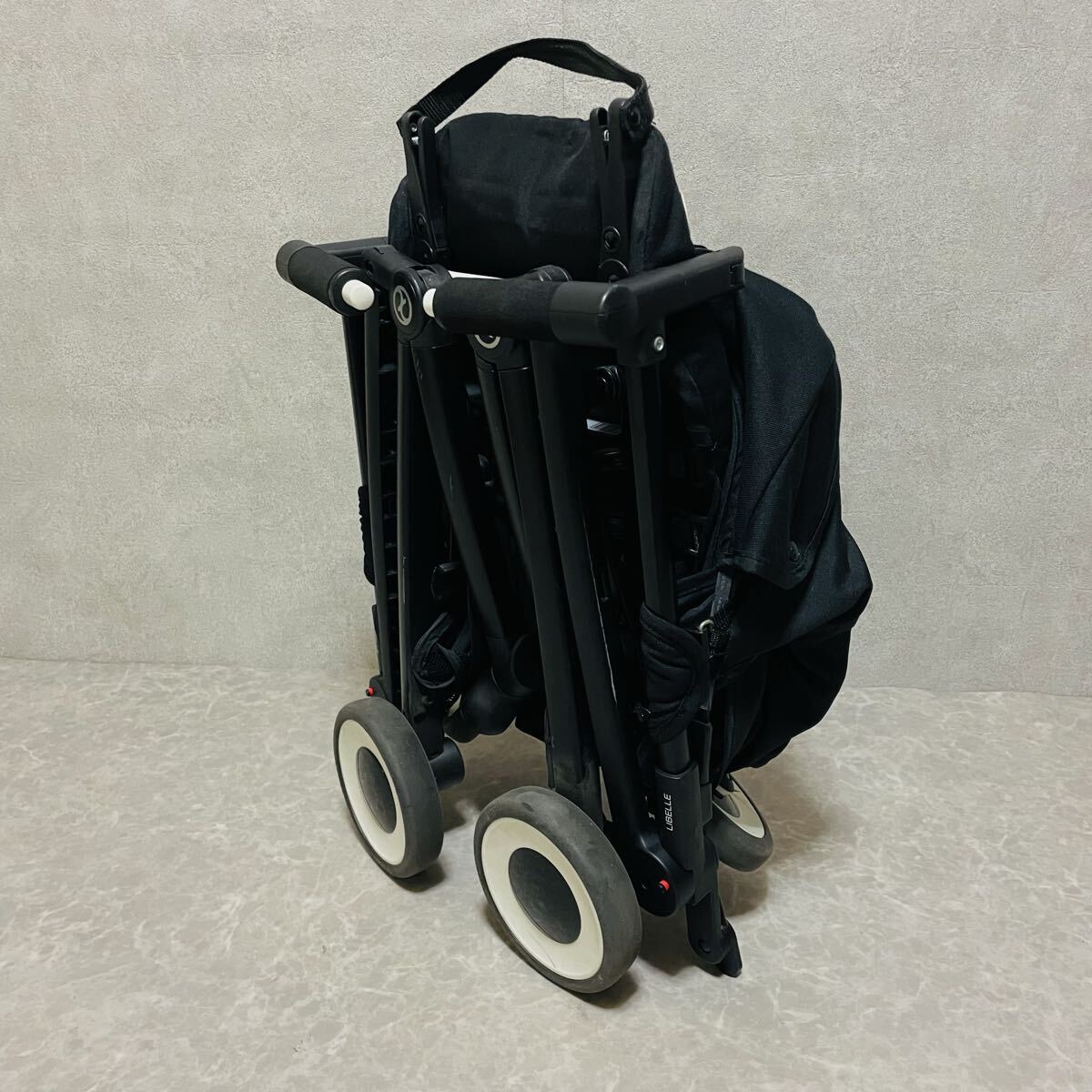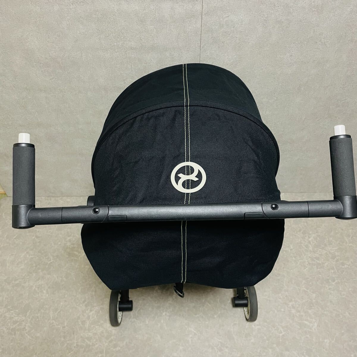 ムーンブラックのコンパクトベビーカー、5点式ハーネス付きで安全性が高い。