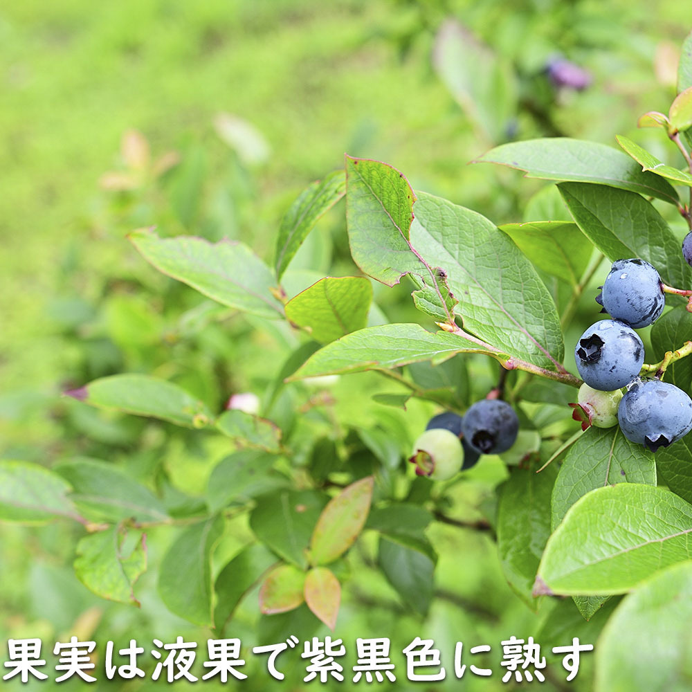 ブルーベリーは、果実が有名で食用をはじめ色々なサプリメントや食品に使われています。実は夏に黄緑色から赤、青紫色・藍黒色へ変化します。葉は明るい黄緑色で秋に美しく紅葉します。花は筒状の鐘形でスズランのような淡桃色です。日本では主に、暖地系のラビット系と寒冷地のハイブッシュ系の2系統が栽培されています。ハイブッシュ系が6~7月にラビット系が8月に実がなります。品種改良が行われ多くの品種があります。