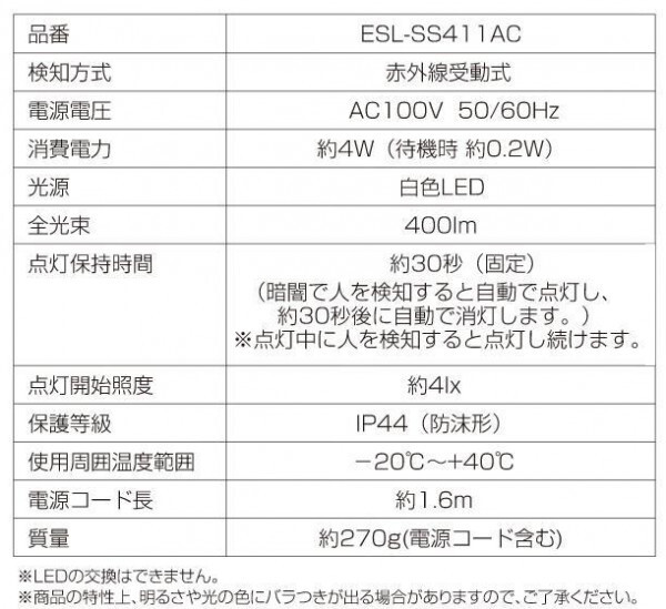 | 付属品 | 取付ネジ2本 コンクリート用スリーブ2本 マスキングカバー1個 取扱説明書 保証書(保証期間:1年) |