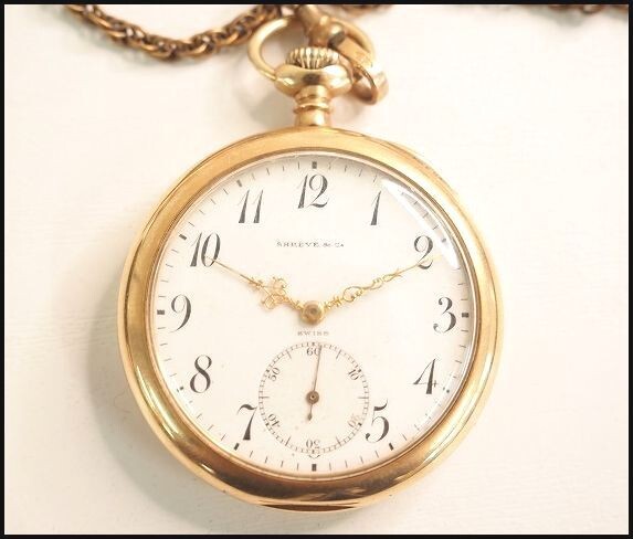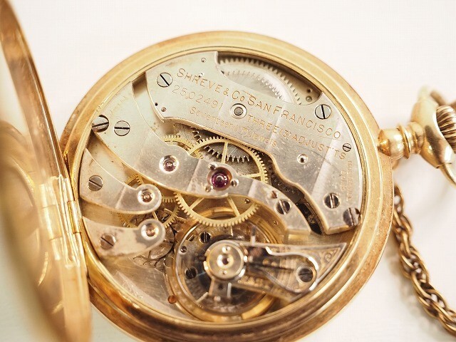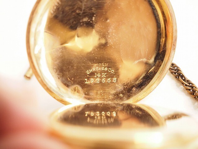 SHREVE&CO san francisco 14K刻印 重量約63.0g アンティーク 手巻き懐中時計 チェーン付 1128b