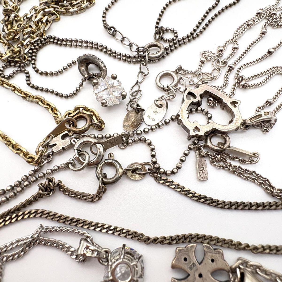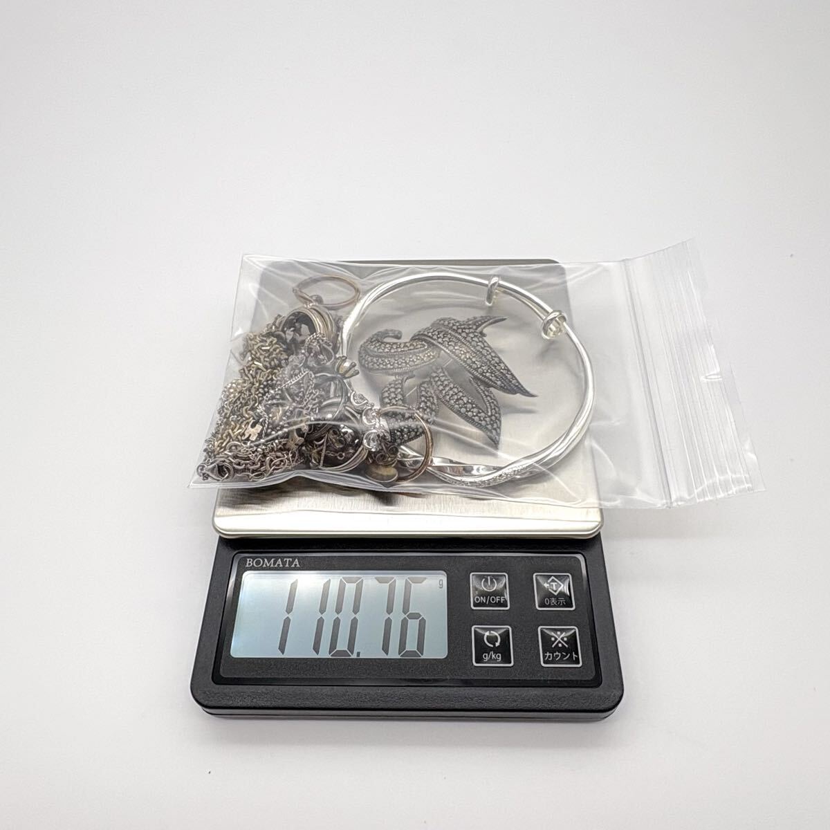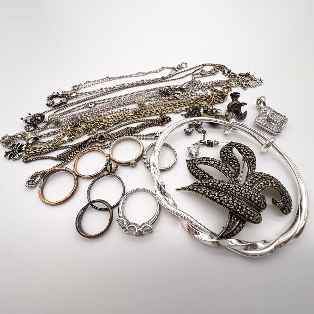 リング、ネックレス、バングル、ペンダントトップなどが中心で、ほとんどがシルバー925ですが、中には素材不明やメッキのものもあります。