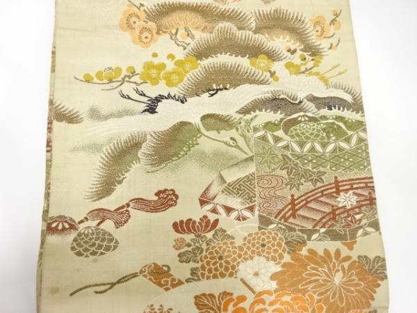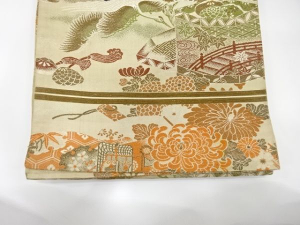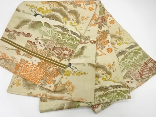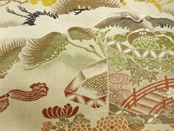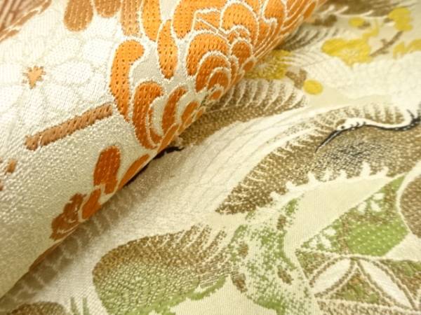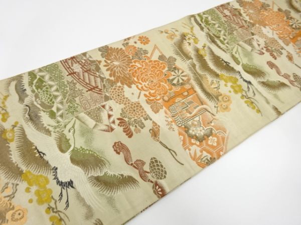ys7539604; 貝桶に鶴・御所車模様織出し丸帯(材料)【アンティーク】【着】