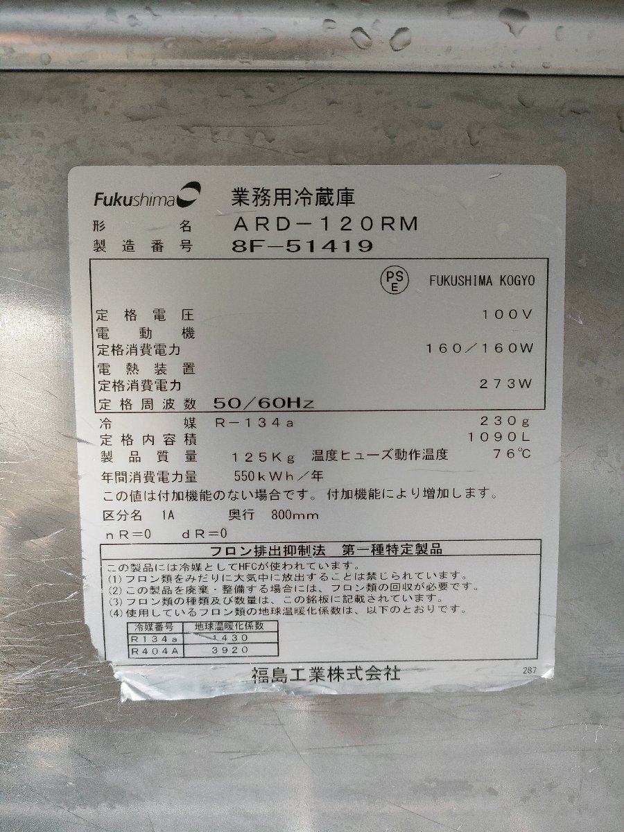 ΦOΦ フクシマ Fukushima 4面冷蔵庫 ARD-120M 2018年製 W1200×D800×H1900 業務用 厨房機器 中古 Y-230216