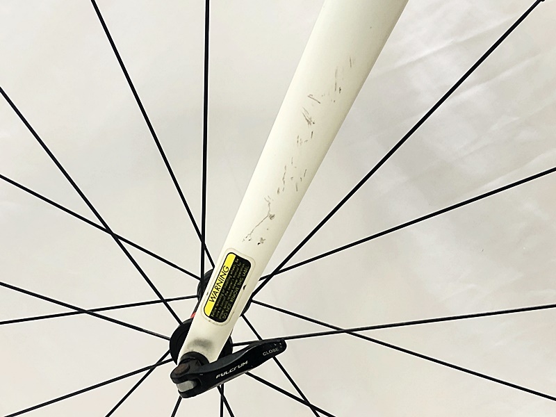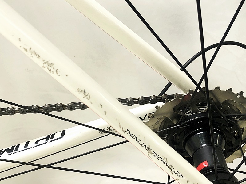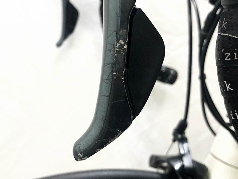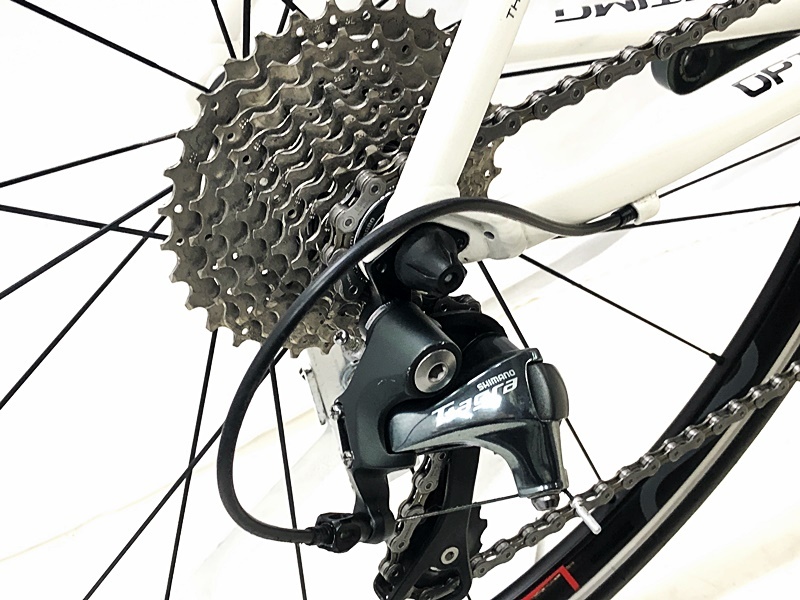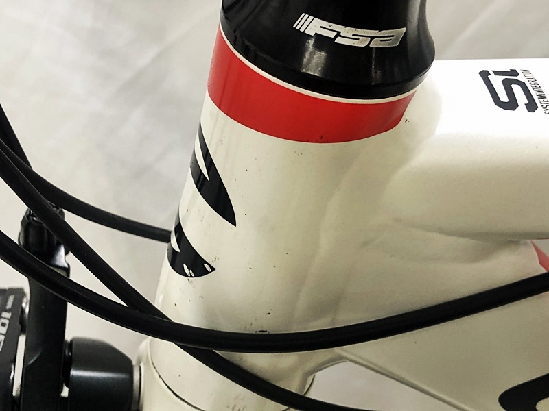 フレーム、その他外観:ヘッドチューブ、フォーク、シートステー、STIレバー、クランク、リアディレイラー、サドル、ステムにキズ、スレ、細かいハゲがあり、バーテープはハゲ、劣化、傷みが見られ、交換推奨となります。