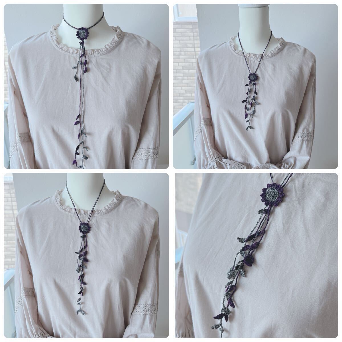 ハンドメイドレース編みラリエット1点(濃い紫色)の出品となります。すべての撮影小物は含まれません。画像3枚目は他にも出品中のラリエットです。