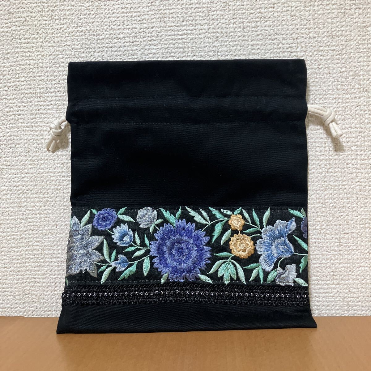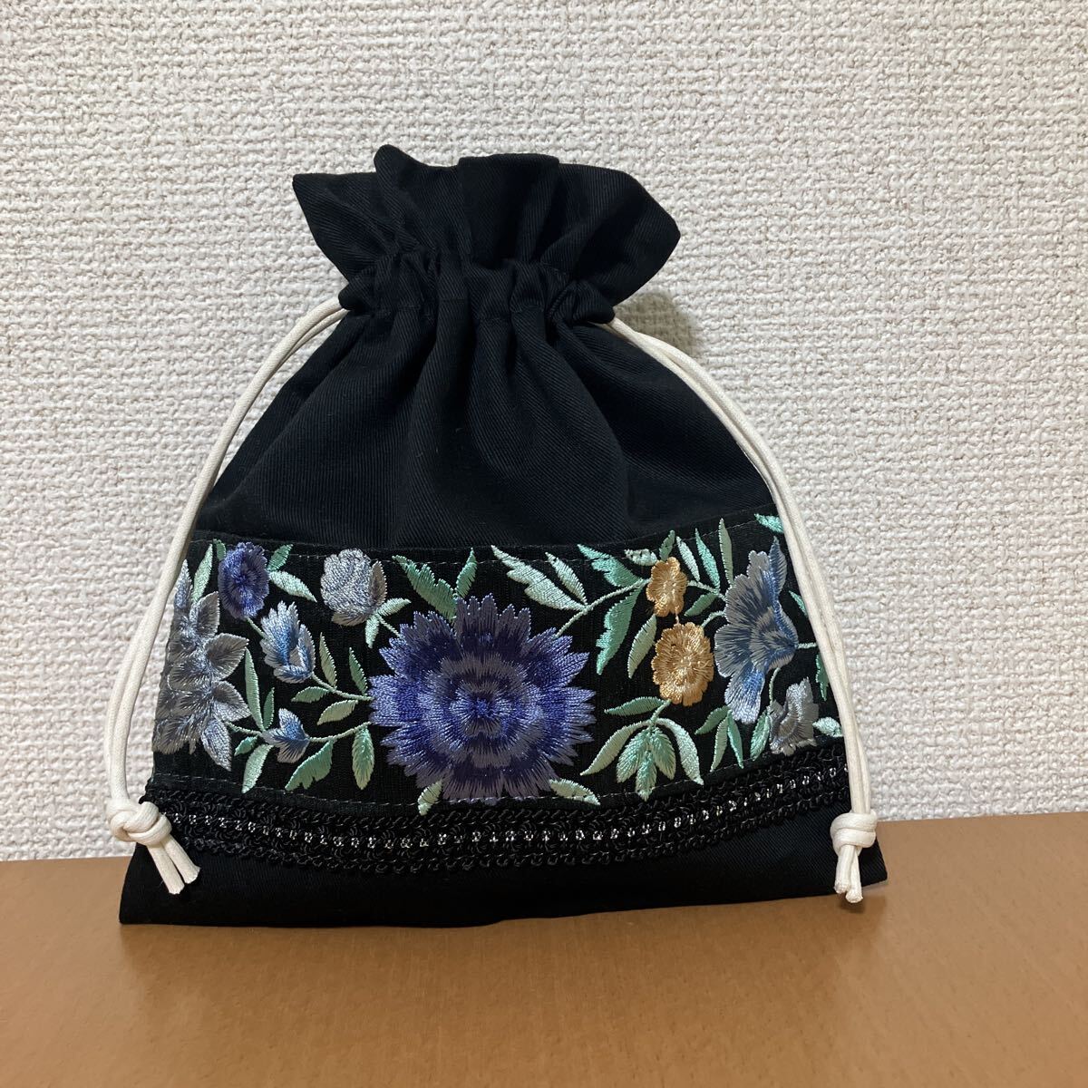 沢山の商品からご覧いただきまして、ありがとうございます。インド刺繍リボンを使って巾着袋を作りました。接着芯は貼っていません。表生地の片面のみリボンを使用しています。インド刺繍リボンは、繊細な作りのため、糸が出たりほつれたりする可能性があります。ご了承の上、入札をお願いいたします。