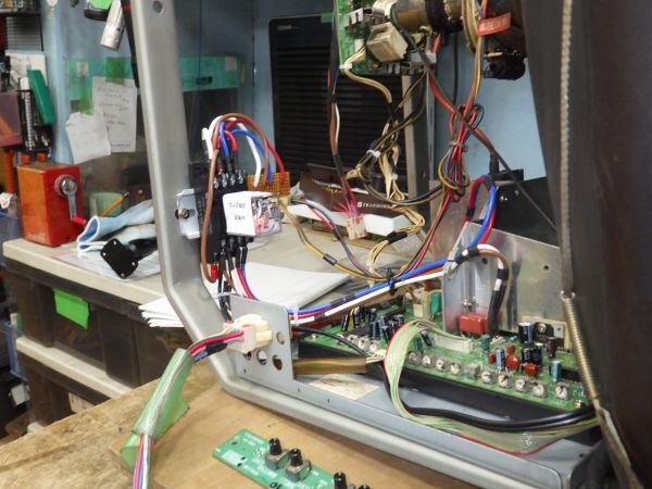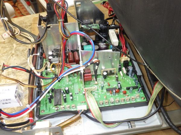②モニター調整基板をはずす 正面の左の奥に電源とカラー信号線のハーネスの12Pのコネクターのロックを押して抜く |