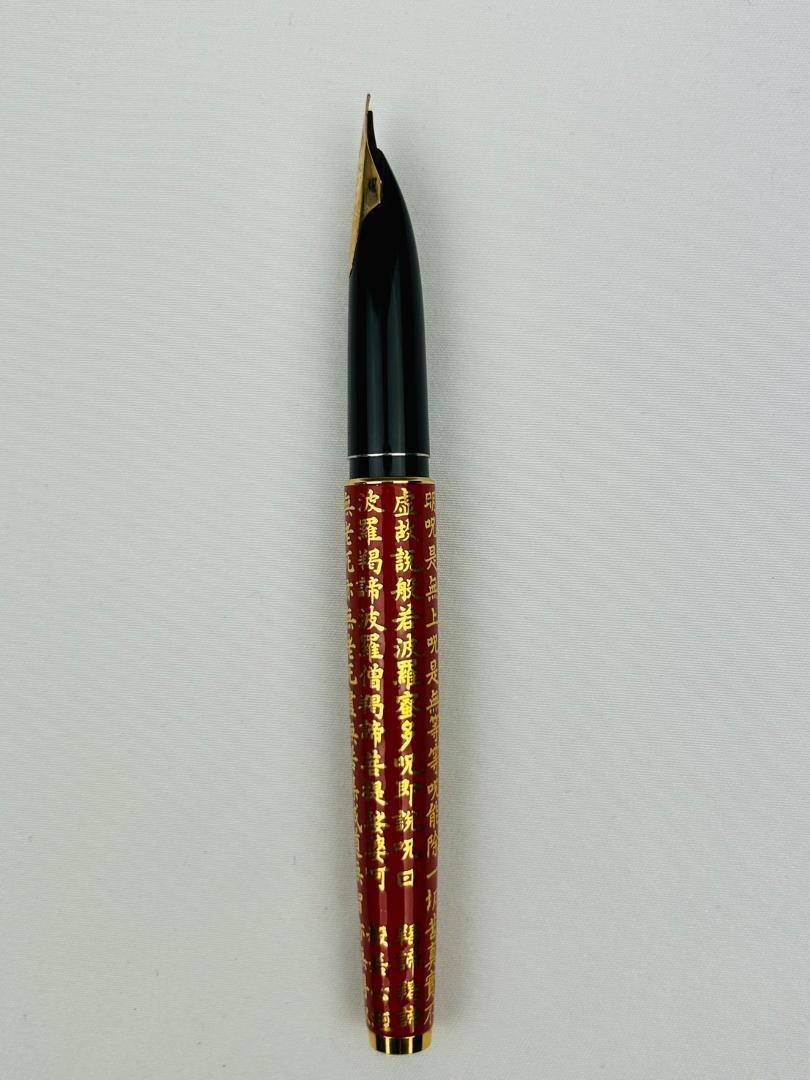 漆を思わせる深みのある赤軸に、般若心経が金色で美しく書かれた希少なパイロット万年筆です。