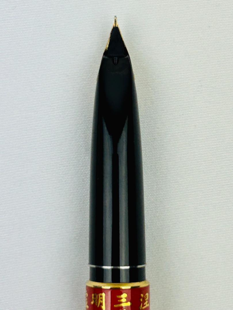 漆を思わせる深みのある赤軸に、般若心経が金色で美しく書かれた希少なパイロット万年筆です。