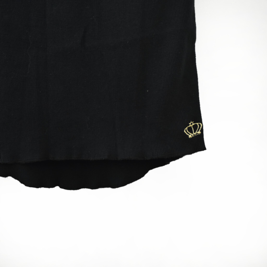 伸縮するリブ素材 裾はラウンドしており、サイドに刺繍が施されております