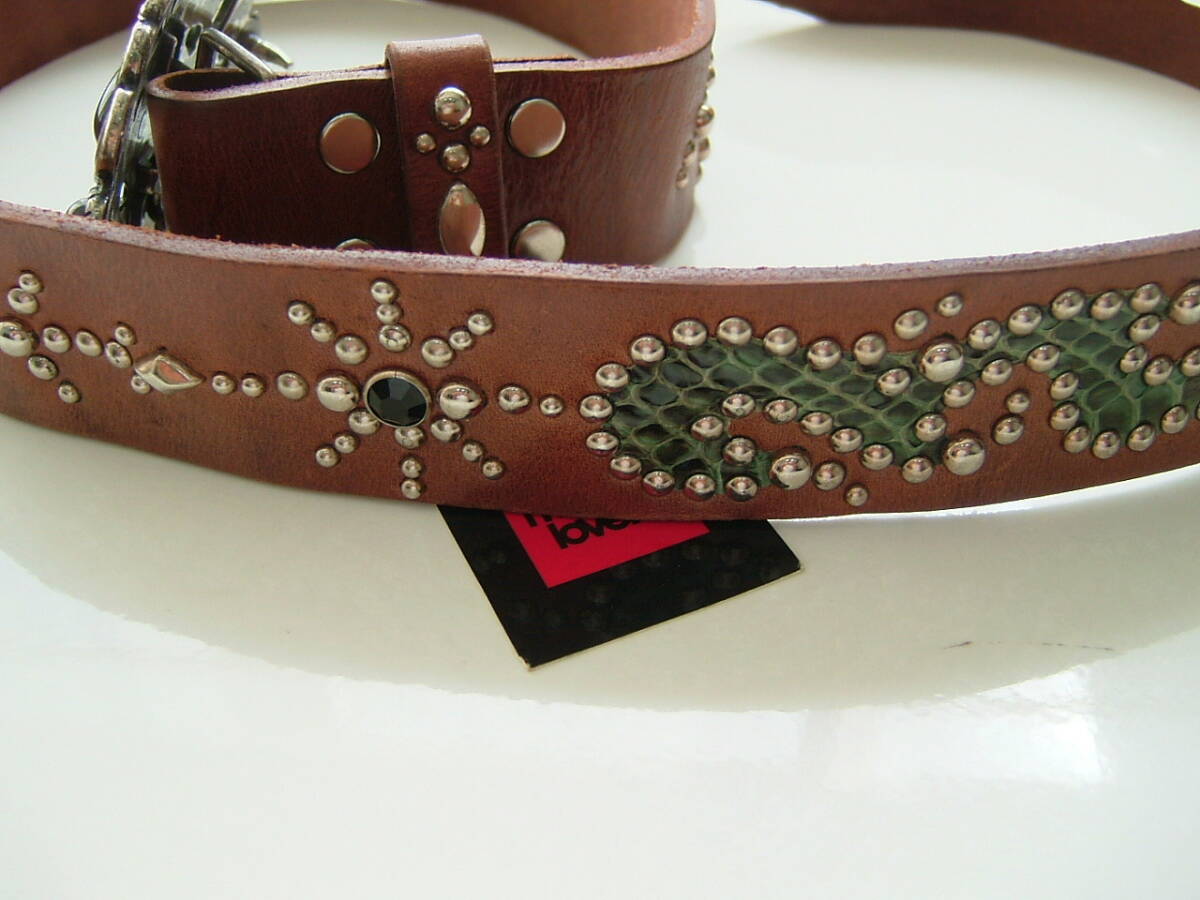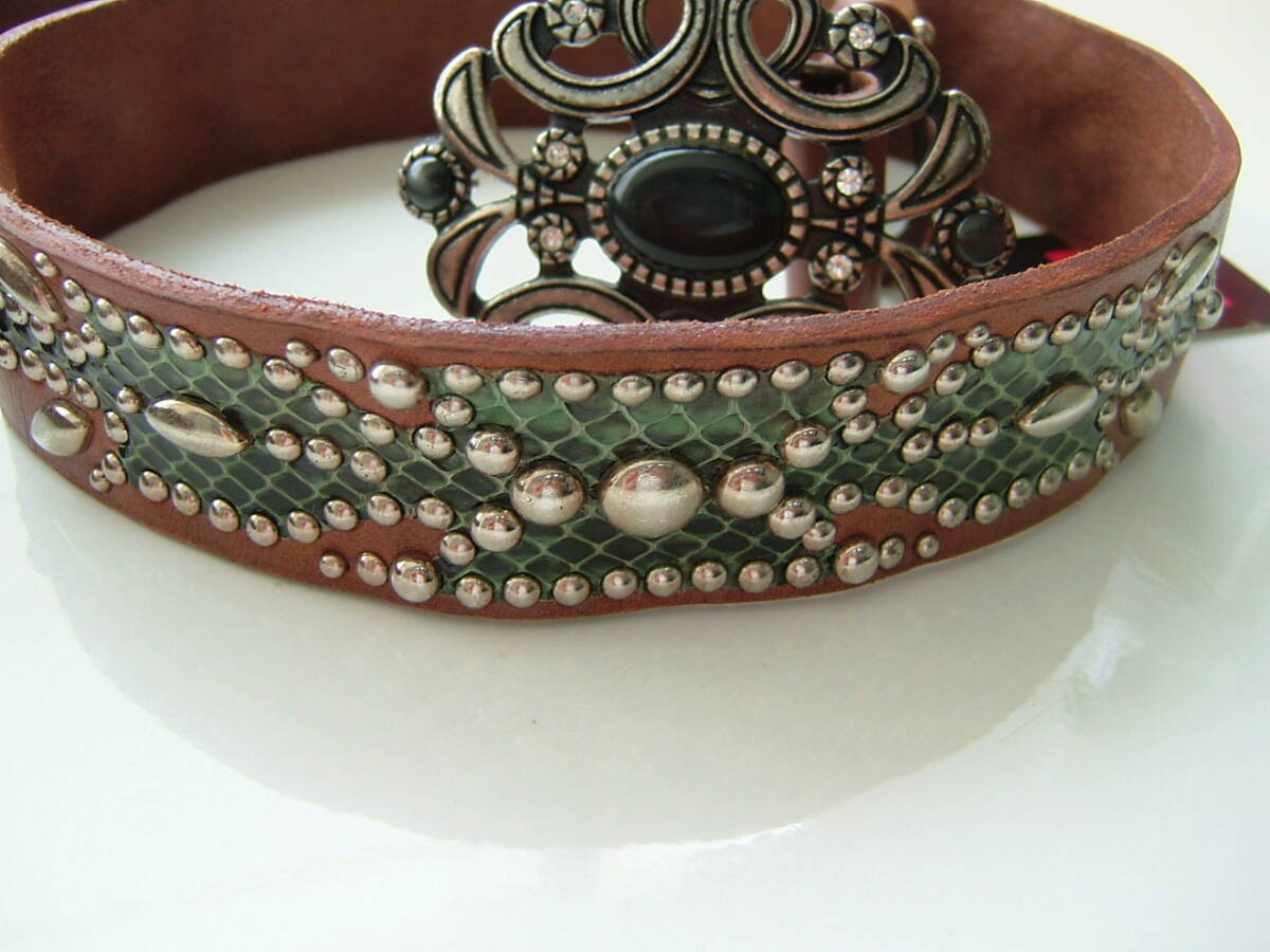 ■蛇ヘビ本皮革レザーを装飾させて多数のスタッズとラインストーン+黒石を施した本皮革レザーベルト