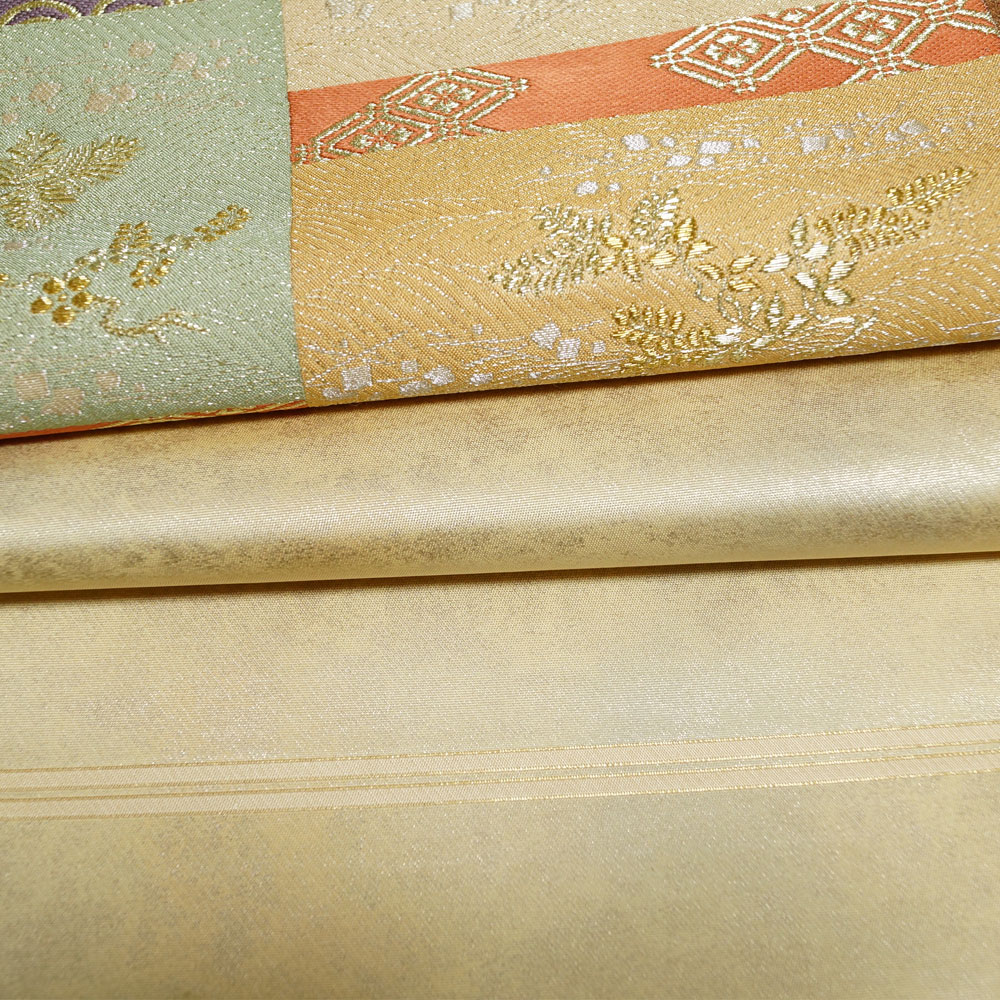 | 商品 説明 | 薄金・生成り色系ぼかしの地に違い段に松や菊、桜、切れ箔、吉祥模様などが織られた袋帯です。 |