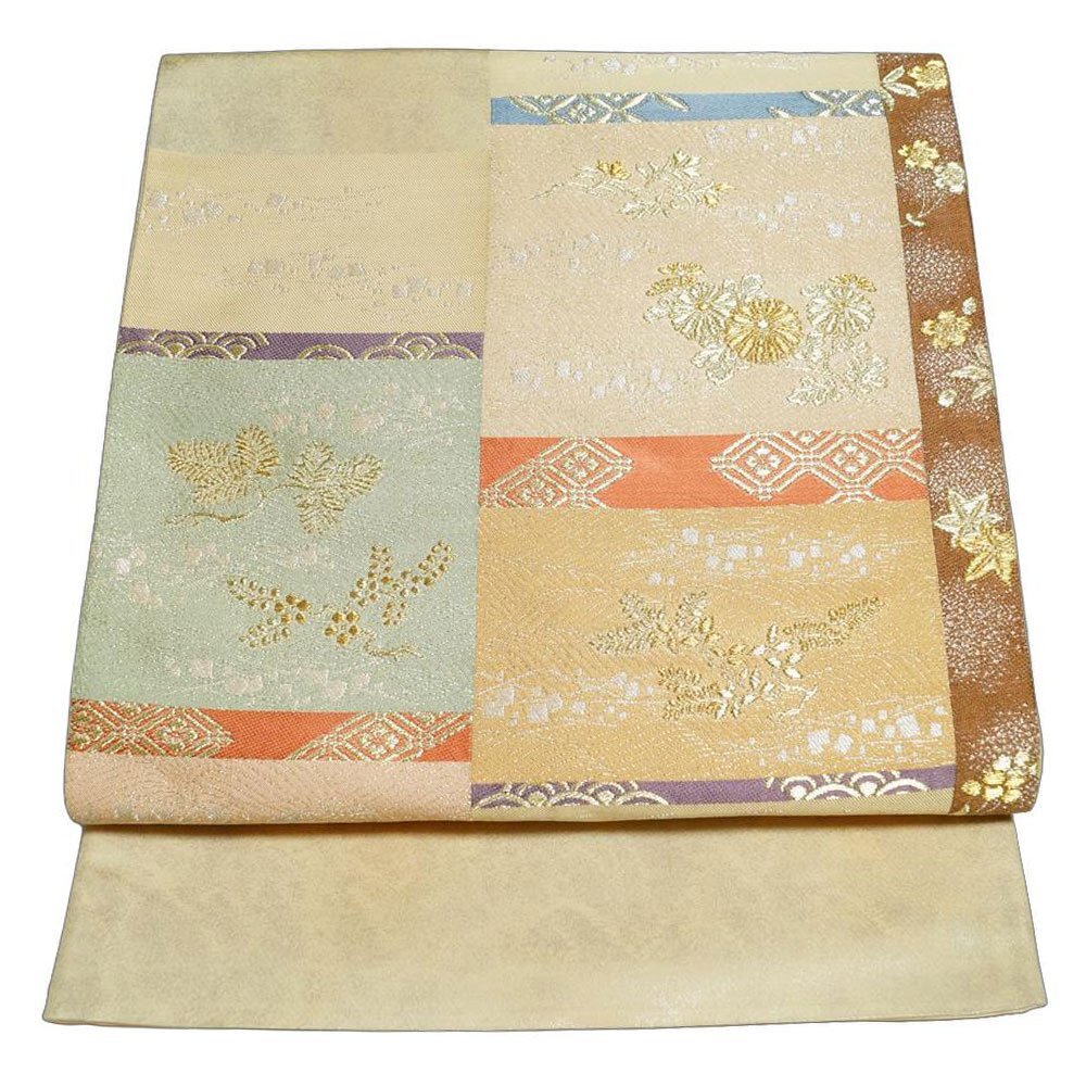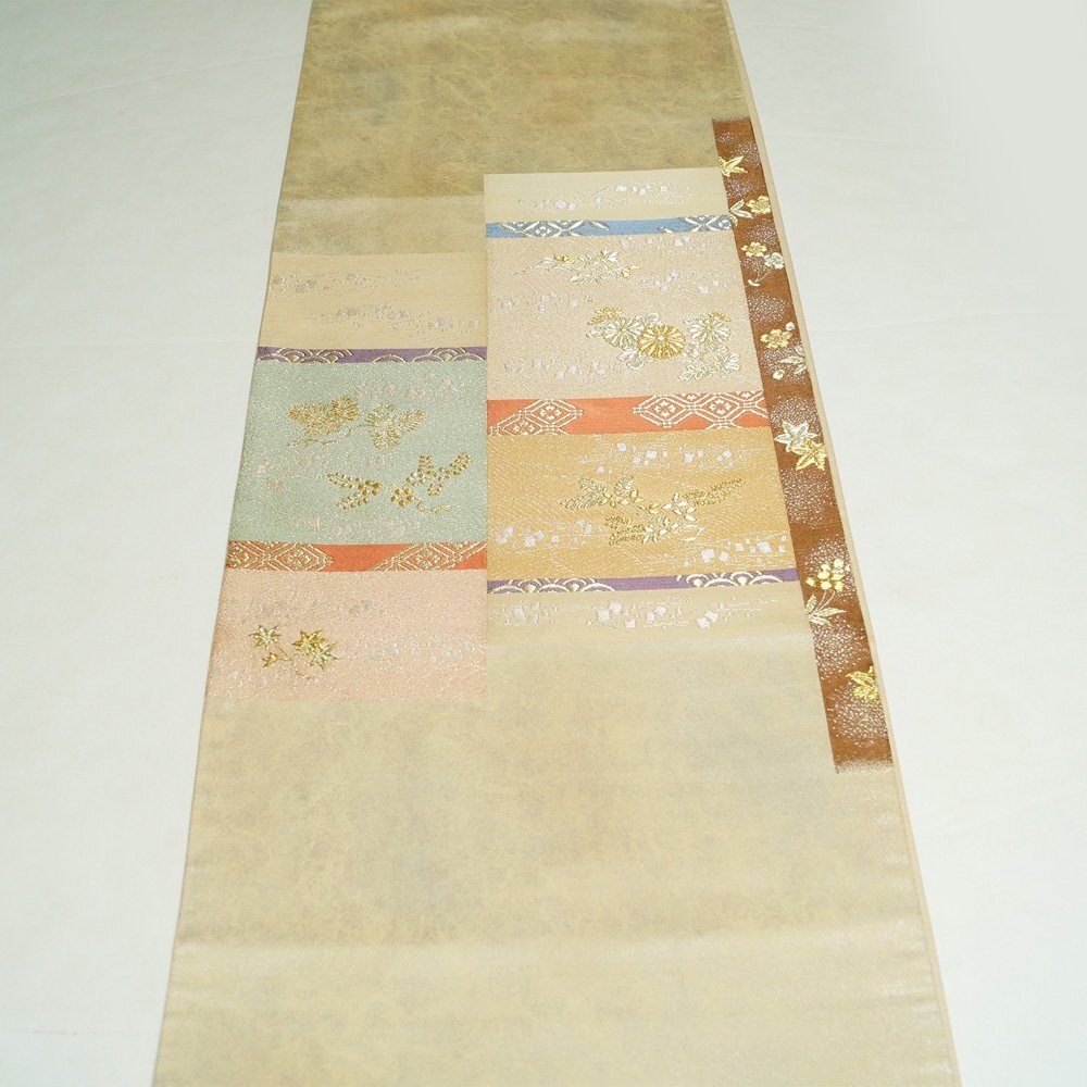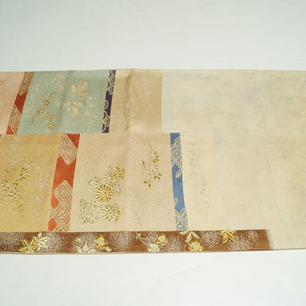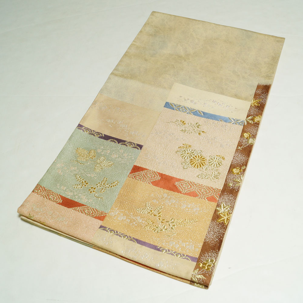 | 品 名 | 袋帯 違い段に春秋植物模様 金銀糸 お太鼓柄 薄金・生成り色系ぼかし 【袋帯 中古 袋帯 リサイクル 袋帯 フォーマル 袋帯 リサイクル着物 帯 正絹 袋帯 モダン 着物 袋帯 中古】 | ||