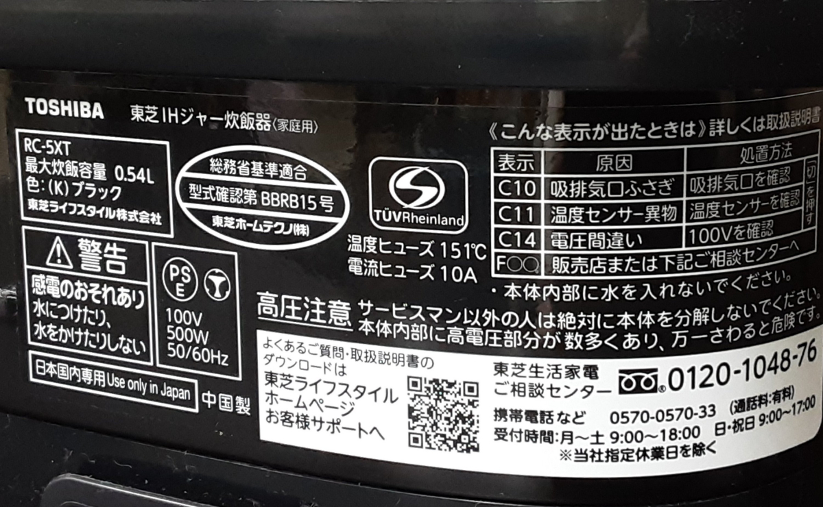 【A720】中古品 TOSHIBA RC-5XT 動作確認・簡易清掃済み IHジャー炊飯器 2023年製 0.54L ブラック 東芝 | |||