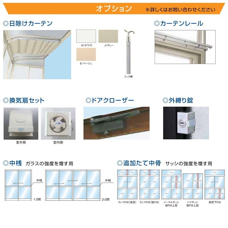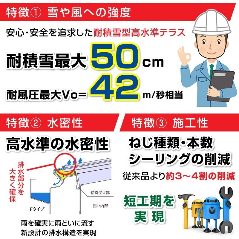 | 商品詳細 | この度は数ある商品の中から当商品を閲覧頂きまして有難う御座います。 商品定価 2,039,620円 ⇒ 販売価格 815,760円(送料・税込み) ●洗濯物干し場はもちろん、趣味の場所としてなど幅広くお使い頂けます。 ●室内との段差が少なく履物を履きかえることなく、出入りのしやすい設計。 ●窓サッシのクレセントレバー(鍵部分)が大きく、開閉の操作がしやすい。 ●最近の住宅サイズにマッチしやすい床高600mm設計。 ●床面は濡れても安心な塩ビ製デッキ。 特殊樹脂コーティング処理を施し劣化しにくく変色しにくい耐候性を有しています。 商品名:テラス囲いR屋根タイプ カラー:プラデッキ:アッシュグレー・マロンブラウン ※フローリング(ブラウン)は要加算 本体:ライトステン・ライトブラウン・ライトブラック・ライトホワイト(受注生産) 屋根材:ブルースモーク・ブラウンスモーク・クリアマット2 ※熱線遮断ポリカ(熱線ブルースモークマット・熱線クリアマット2)は要加算 サイズ:間口3.5間6370mm(柱芯々)=単体1.5間2760mm+連結2.0間3640mm× 出幅:7尺2070mm(壁面~前枠内側) 高さ:地面~前枠下まで2500mm ガラス5mm普通ガラス(透明)・型模様4mm板ガラス(受注生産)中桟無し ※組立説明書を事前にご希望の方はメールでの添付は可能(FAXは不可)です。 材質:アルミ形材 ポリカーボネート樹脂材 デッキ部分は塩ビ製デッキ材 仕様:ノーマルサッシ ランマ無し、プラデッキ仕様(デッキ厚30mm) 積雪:一般地域用(積雪20cmまで) 正面:掃出しサッシ4枚組(但し1.0間は2枚組) 側面:掃出しサッシ2枚組(但し3尺はFIX中桟有り/固定、9尺は4枚組) ※オプションにて、耐積雪50cm仕様や、熱線遮断ポリカーボネート仕様、網戸、 二重構造で強度が優れている「フローリング仕様」も御座います。 お気軽にお問い合わせ下さい。 ※備考:サンルームに比べると気密性は高くありませんので、強い雨風の際に、 室内へ雨水が浸入する場合もございます。ご注意下さい。 FIXガラスは現場組付となります。 妻FIXポリカはクリアマット2のみとなります。 出幅3尺は2枚掃出しサッシではなく、FIXになります。 出幅9尺は2枚掃出しサッシではなく、4枚掃出しサッシになります。 出幅7尺~9尺は、中間に大引きとツカが入ります。 また、出幅6尺・フローリング仕様の場合も同様です。 [使用上のご注意] 製品の破損などによる身体への重大な事故につながる恐れがありますので、以下の使い方を守ってください。 ◎下表の積雪量になる前に、必ず雪下ろしを行ってください。 新雪(しんせつ) 降り積もったばかりの雪 締雪(しまりゆき)積雪の重みで圧縮された雪 粗目雪(ざらめゆき)一度解けて再度凍って細かな氷の粒が集まった雪 1cmあたり約30N/m2(3kgf/m2) 雪比重:約0.3 1cmあたり約50N/m2(5kgf/m2) 雪比重:約0.5 1cmあたり約70N/m2(7kgf/m2) 雪比重:約0.7 雪下ろしの目安 標準タイプ20cm(600N/m2) 新雪20cm 締雪12cm 粗目雪8cm 積雪タイプ50cm(1500N/m2) 新雪50cm 締雪30cm 粗目雪21cm (注)数値はおよその目安です。 本文積雪量は1cmあたり30N/m2(比重0.3)の単位量にて算出しています。 湿った雪の場合、lcm当たりの重さがさらに大きくなる場合がありますので、早めに雪下ろしを行ってください。 ●床に制限荷重1,800N/m2(183kgf/m2)以上の荷重をかけないでください。 商品が破損するおそれがあります。 ●天気の良い日や夏場は室温が上昇しますので、充分換気してください。 ●屋根に乗ったり、または柱に登ったり、ぶら下がったりしないでください。 ●屋根には重量物を乗せたり、温水器、ソーラーパネルなどを設置しないでください。 ●サンル-ムとして居室に使用することは避けてください。 ●商品に電線を巻き付けないでください。漏電により感電する恐れがあります。 除草剤及び殺虫剤などの化学薬品が付着しますと、 変色及び腐食の恐れがありますので、洗い流してください。 ●木製家具等を長期間置くと、色あせ、そりが生じることがありますのでご注意くださ い。 ●使用状態により結露が発生し、屋根から落ちてくる場合がありますので、カ-ペット等 の使用及び洗濯物等の取扱いの際はご注意ください。 ●直射日光が当たると床材が退色する恐れがありますのでご注意ください。 ●プラデッキ、フローリングの上で、シンナー、べンジン、灯油等の溶剤類は使用 しないでください。近くでの火気の使用は避けてください。 ●表面がぬれている時は、すべりやすくなりますので注意してください。 ●物干し竿にぶらさがらないでください。物干し竿を必ず使用し、ロープ等をかけて使用 しないでください。 [設計・施工上のご注意] ●弊社の工クステリア商品は、社内基準に準拠しており、安全にご使用いただけるように 設計されています。 その設置場所や地域・用途により法規や条例などの制限を受ける場合がありますので 設置する場合には、その地域の所轄窓口にご確認ください。 ●商品の施工については必ず取付説明書に従ってください。また、施工完了後に取扱説 明書を施主様にお渡しくだ
