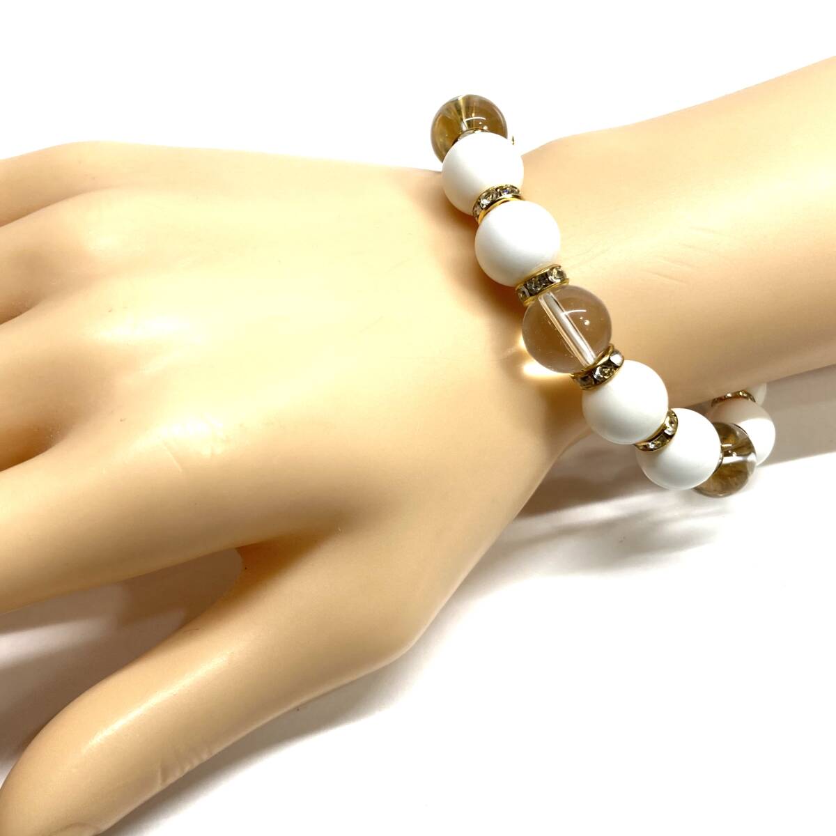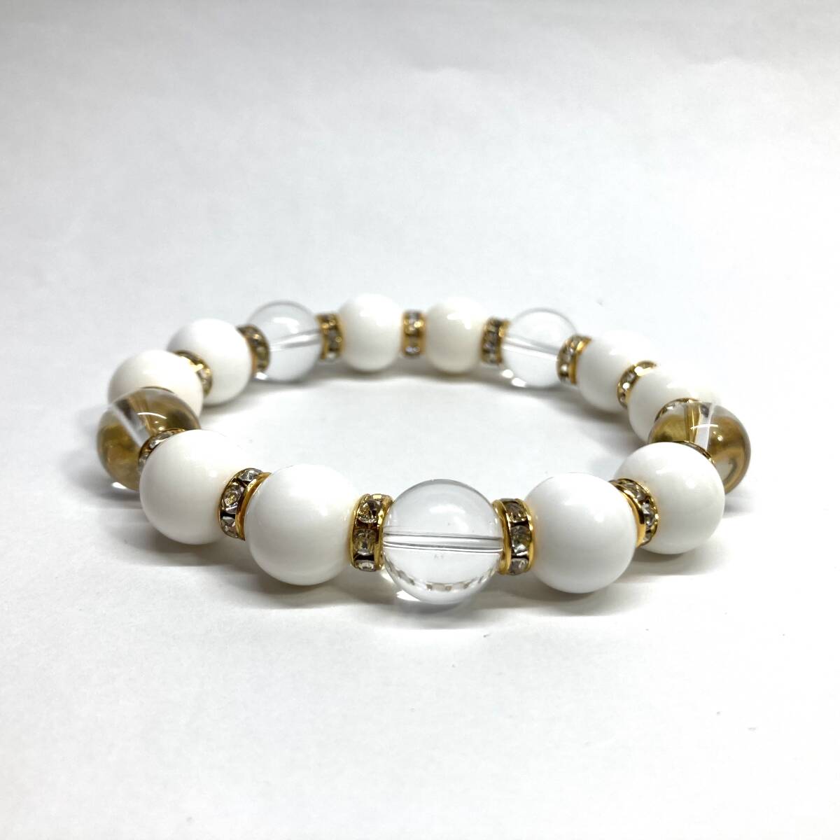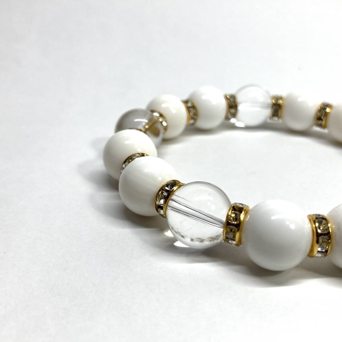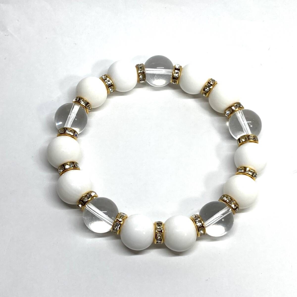 こちらは、ホワイトオニキスと水晶を組み合わせたパワーストーンブレスレットです。間にはロンデルを挟み高級感あるデザインに仕上げております。程よくインパクトがある12mm玉を使用して内周約18cmです。(サイズ変更の場合は取引ナビにてご連絡をお願いします。) 数に限りがございますので気になる方はお早めにどうぞ。