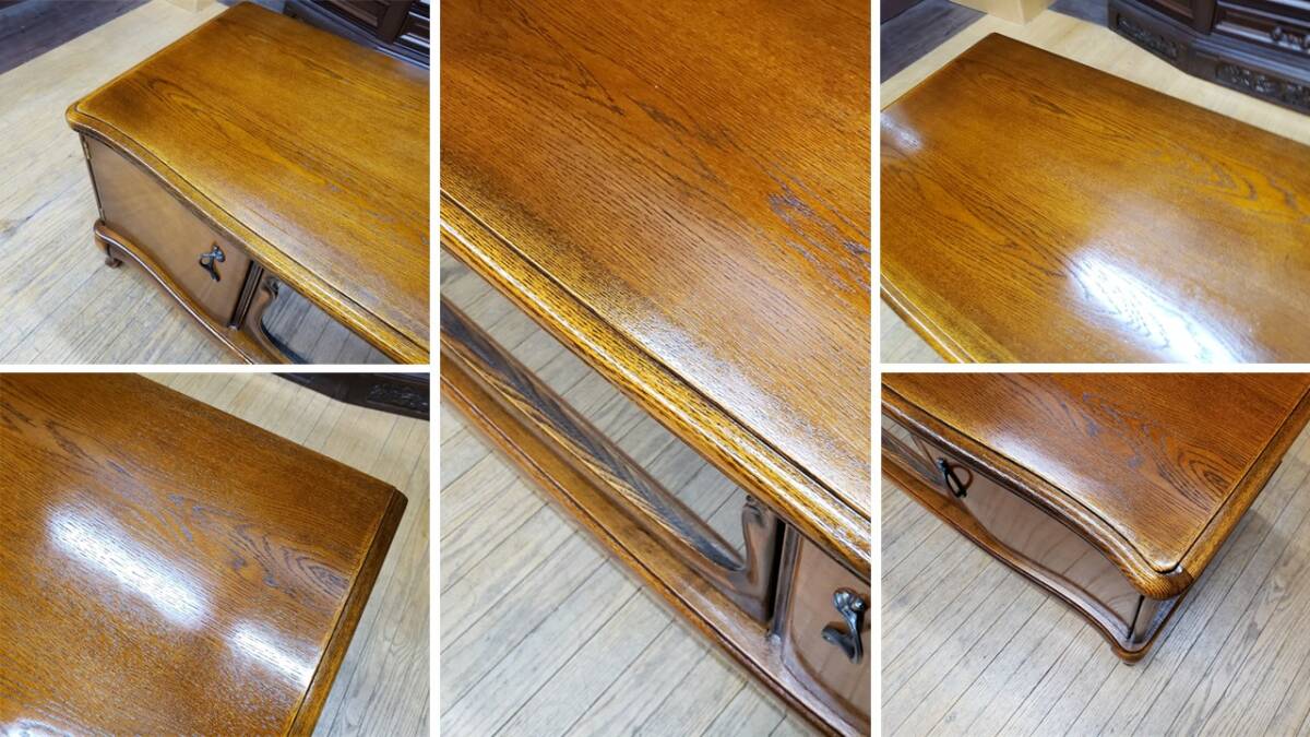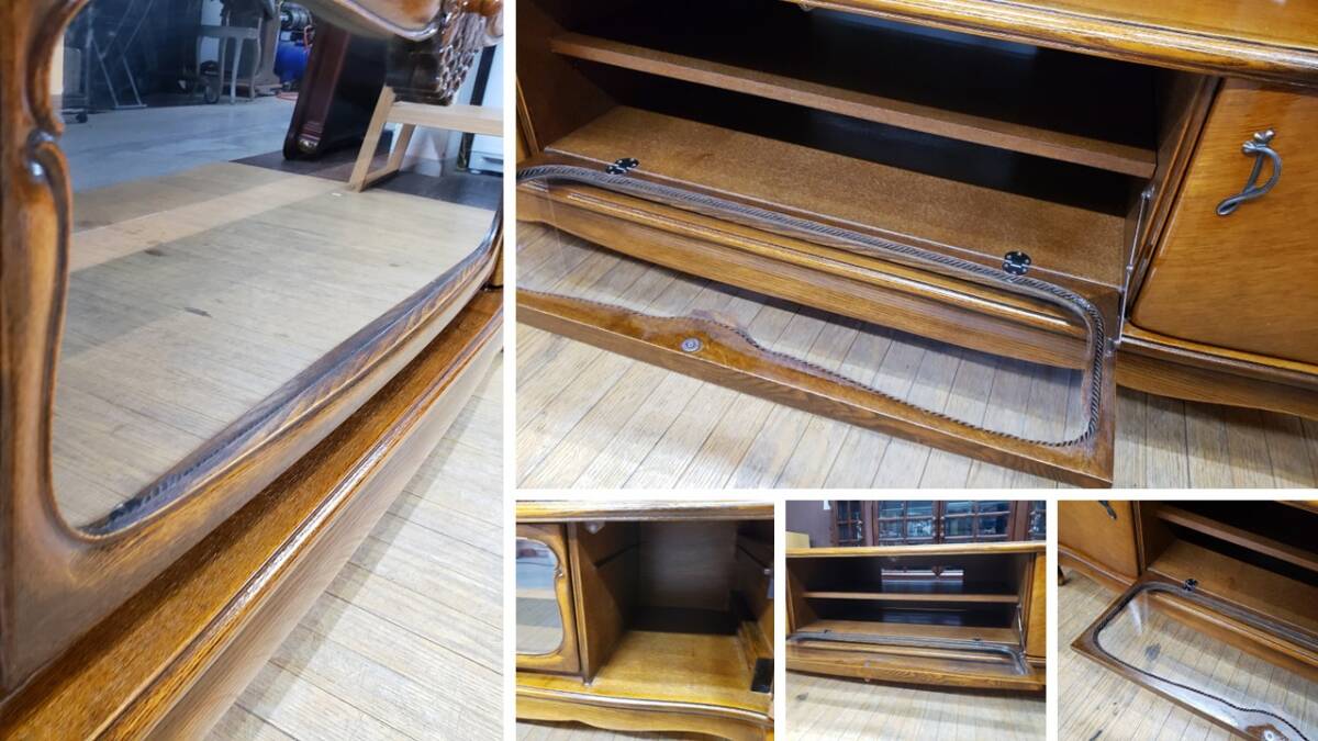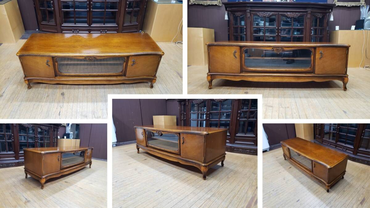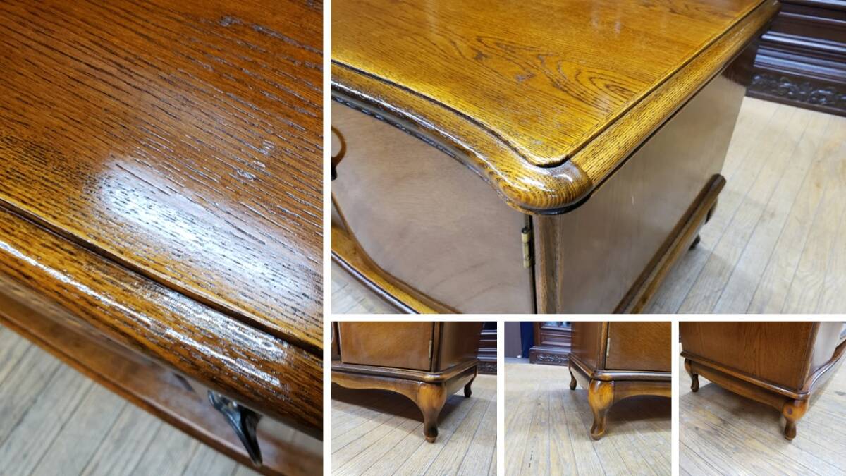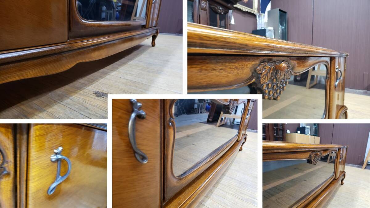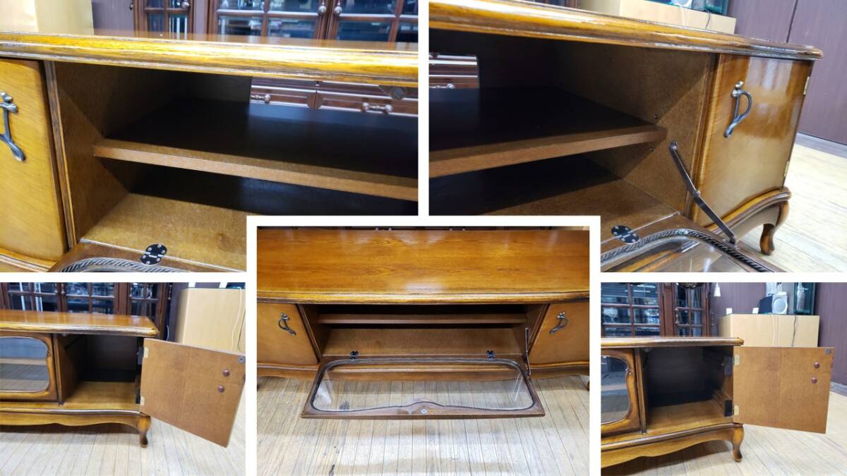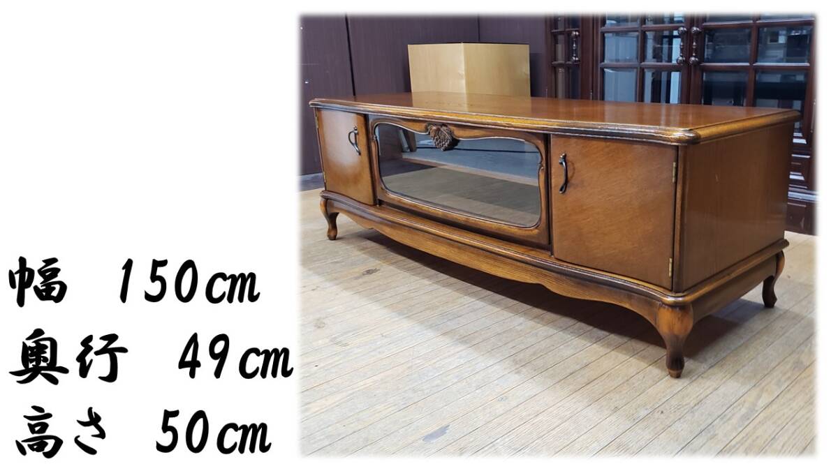 全体的に見ると特記すべき欠点等も無く綺麗ですが、残念な事に正面から見て右側の開き戸内部の引き出しが欠損しております。機能的には問題ありませんが、そのことを承知の上ご購入下さいませ。写真をよくご覧になって判断をお願い致します。USEDとなります。画像をご覧になる環境により実際の色と若干の違いがあるかも知れませんがご了承下さい。【サイズ】幅150㎝×奥行49㎝×高さ50㎝