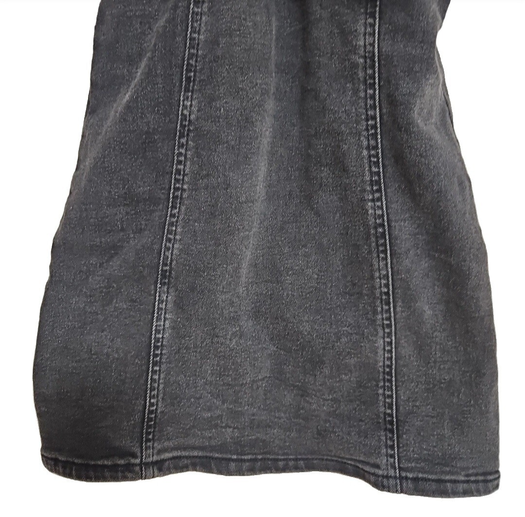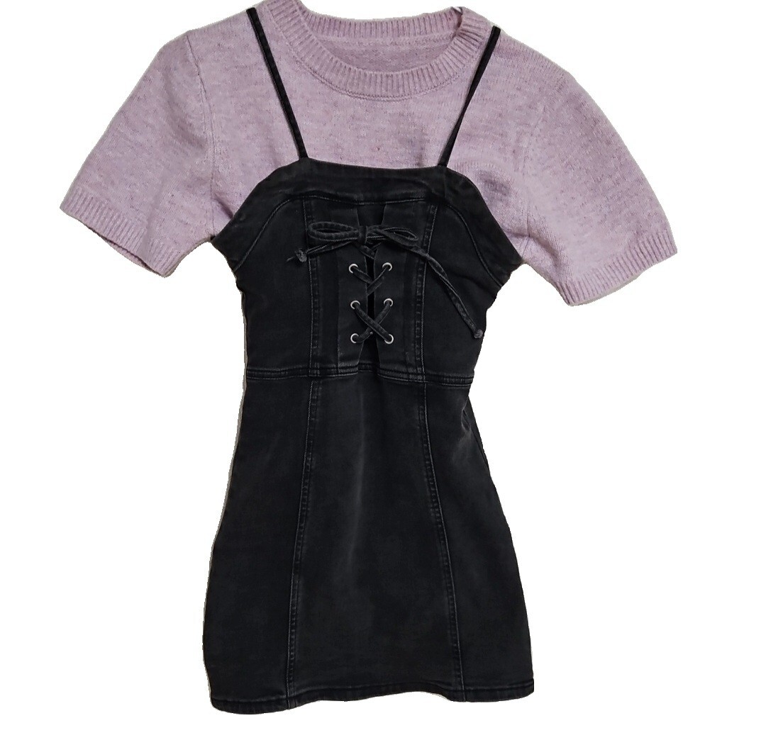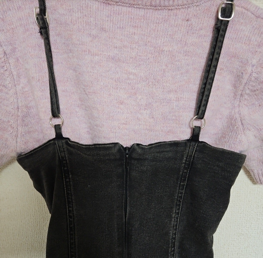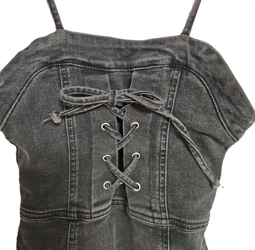 デニム素材のレースアップノースリーブミニワンピース、タイトフィットデザイン。