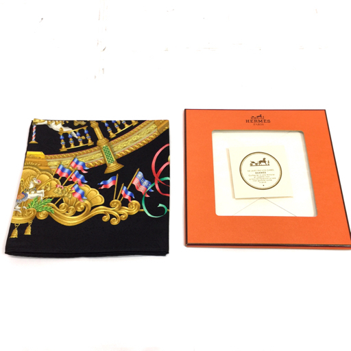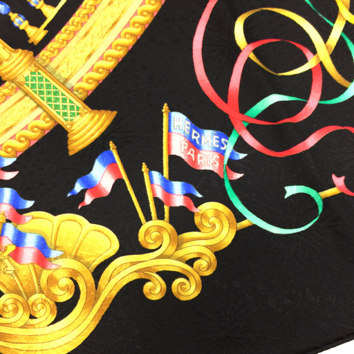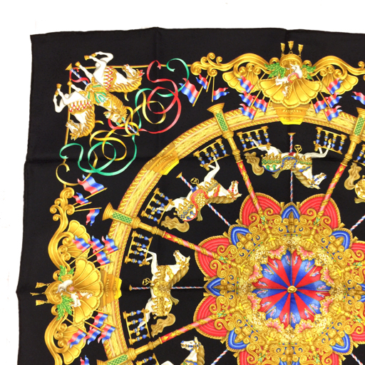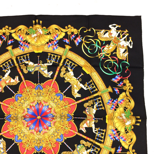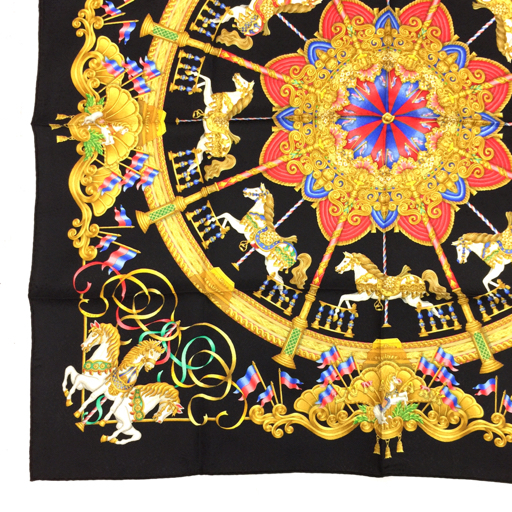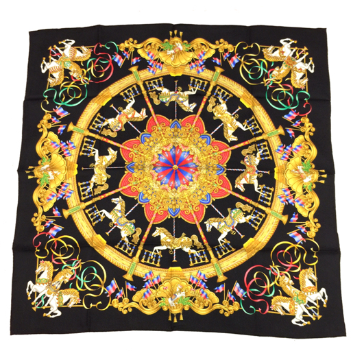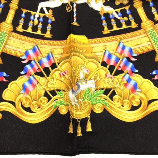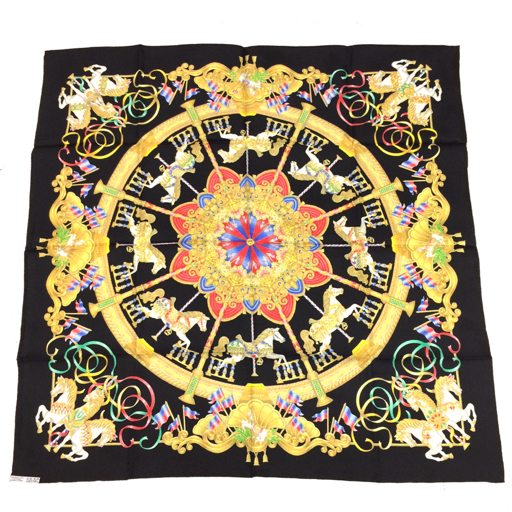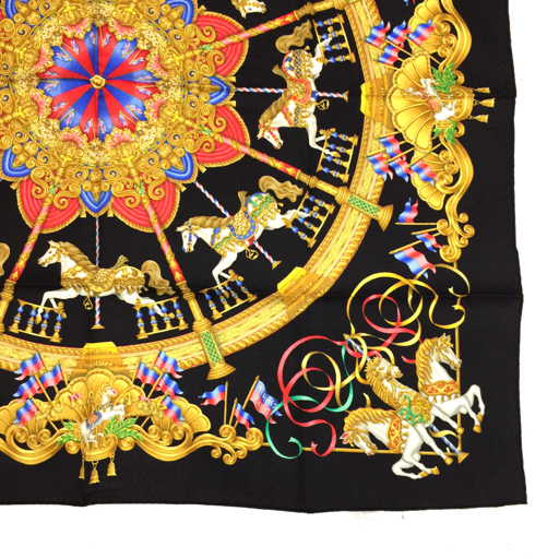 美品 エルメス シルク スカーフ カレ90 LUNA PARK 遊園地 メリーゴーランド 縦88cm×横87.5cm 黒×マルチカラー HERMES |