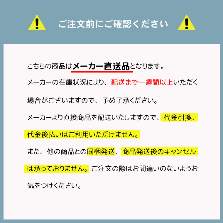 | ◆送料詳細◆ □送料:全国一律 ¥790(税込み) ※※メーカー直送品につき、同梱及び代金引換は出来ません。 ※何点ご落札頂いても送料は1点分でお届け致します。 □北海道・沖縄・離島へのお届けは、追加送料が必要となります。落札後ご連絡致します。 ■配達時間指定は 午前 / 午後(18時まで) ■西濃運輸・ヤマト運輸・佐川急便・その他での発送となります。(配送会社のご指定は出来ません) 日曜・祝日の時間指定は事前にご連絡ください。(配送会社の諸事情により、急な時間指定はお受け出来ません) |