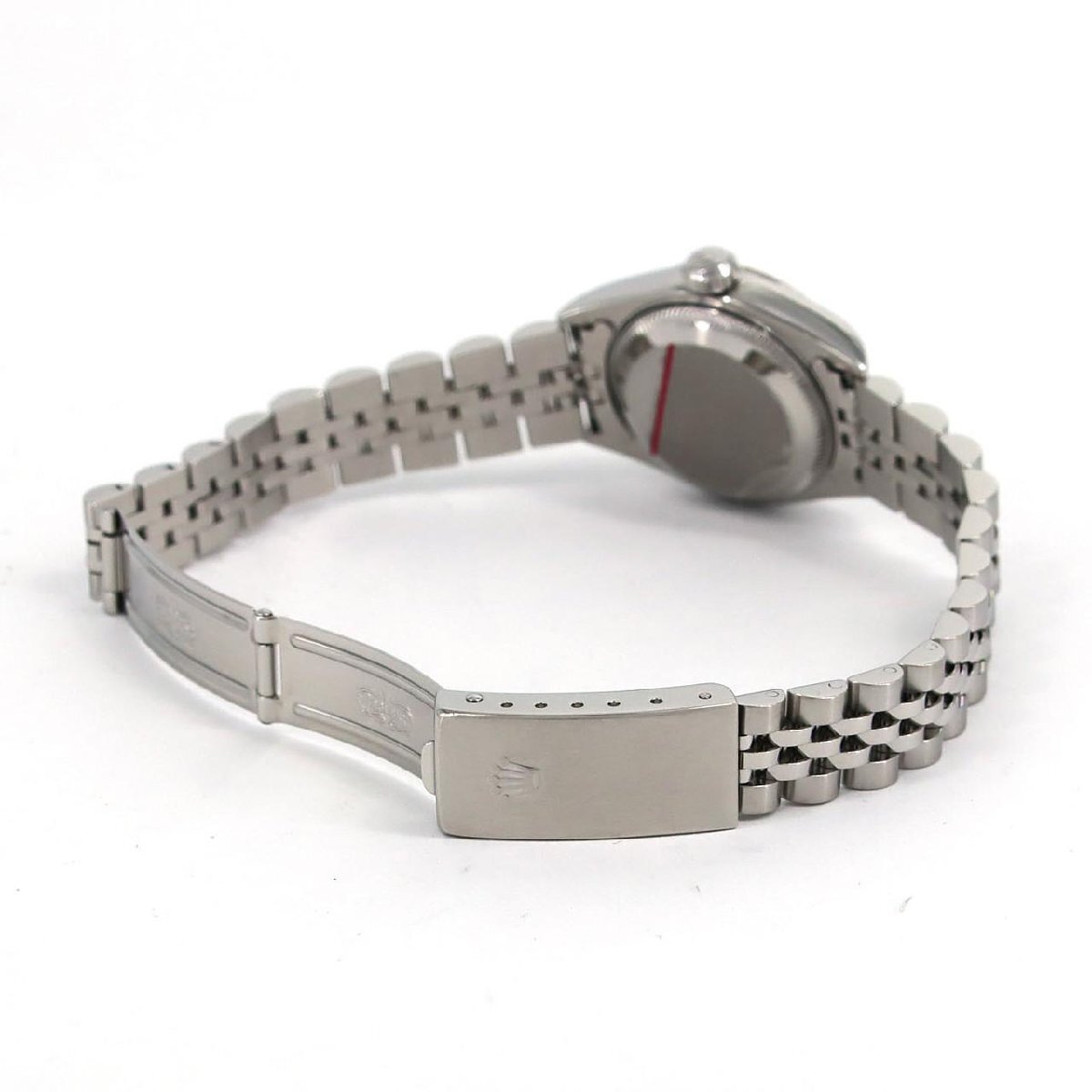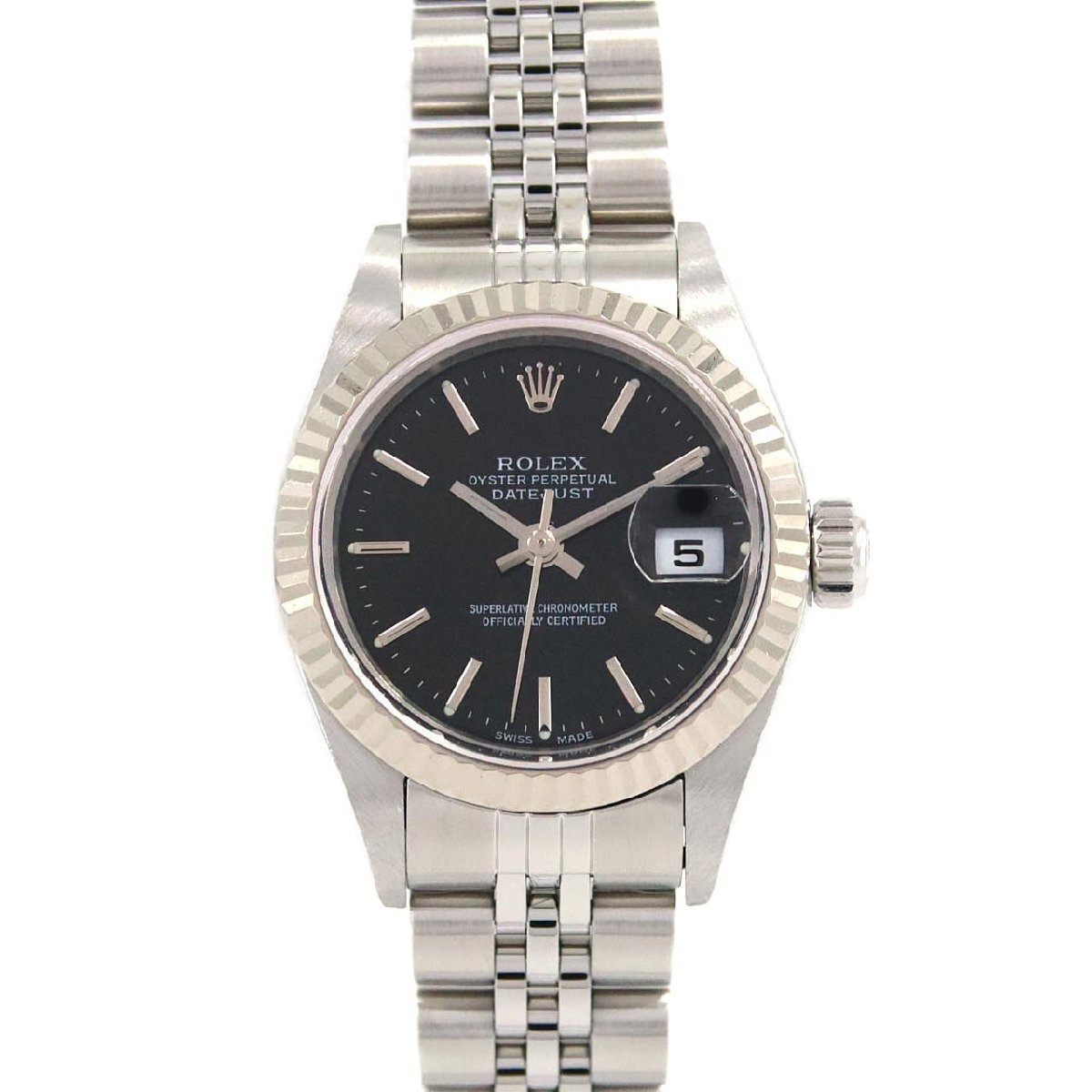 1999年頃から2004年頃まで生産された、ロレックスの定番モデル「レディ デイトジャスト」。ステンレス素材に、ベゼルのみ18Kホワイトゴールドを使用した上品な一本です。キリッと引き締まったブラック文字盤が、フルーテッドベゼルの輝きを一層際立たせ、高い視認性も確保。アイコニックな5連のジュビリーブレスレットを備え、シーンを選ばず使える汎用性と、洗練された雰囲気を両立した人気の仕様です。