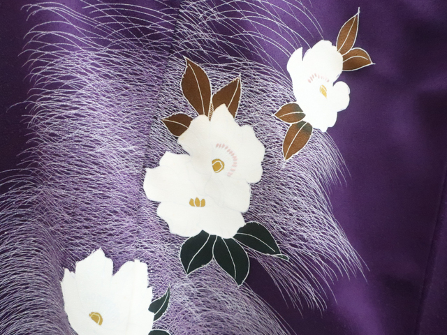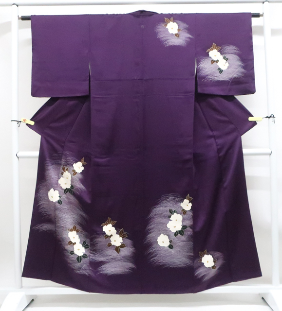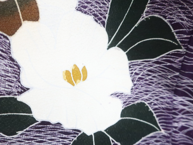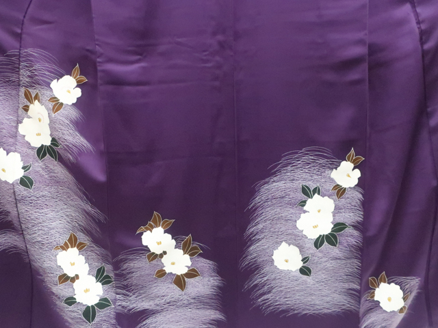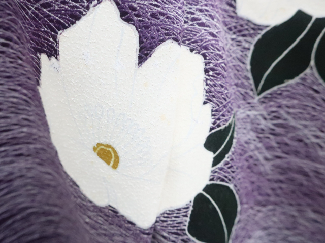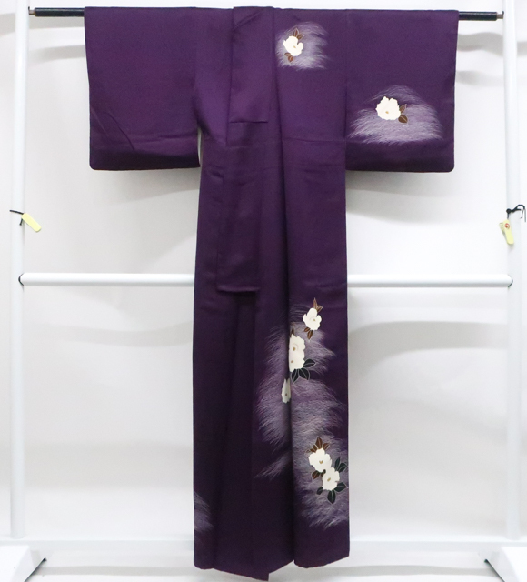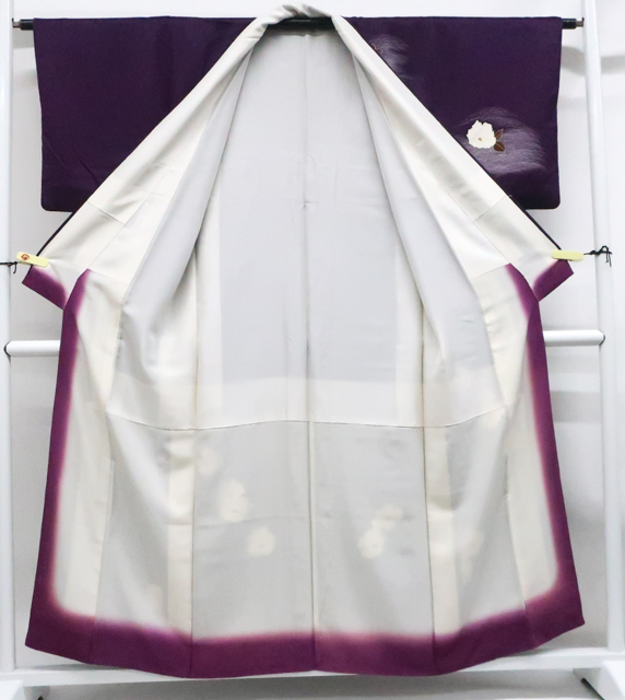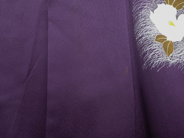 リサイクル商品のため、表柄にしみとひび割れがございます。 衿に汚れがございますが着用可能なお品です。 地色は紫です。 1枚目の画像が近いお色かと思われます。 素材は正絹です。 |