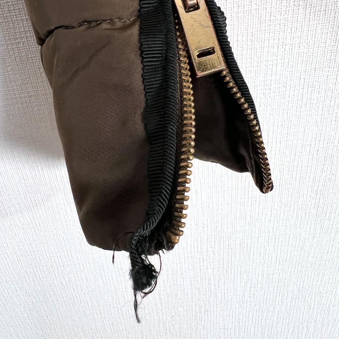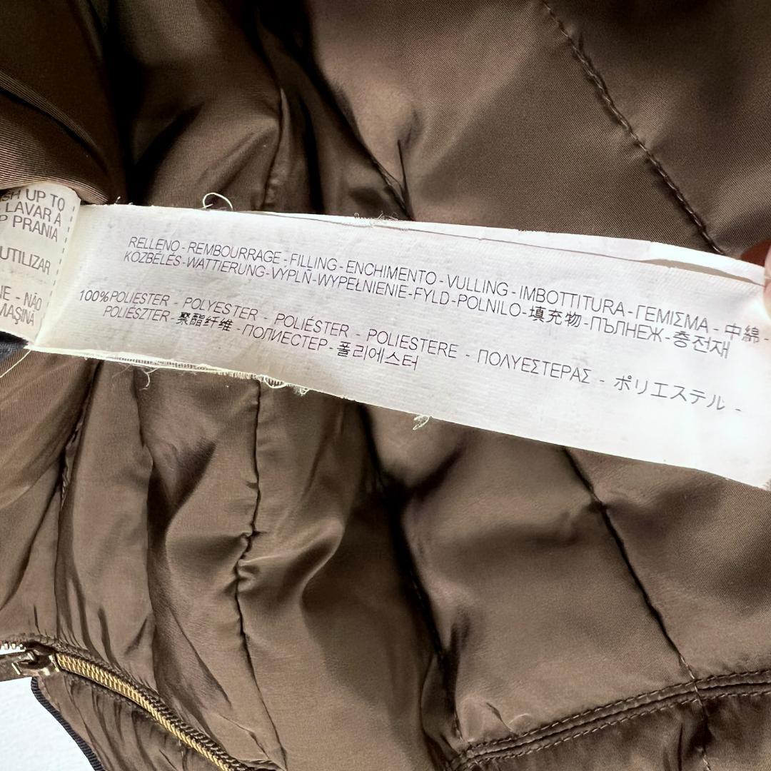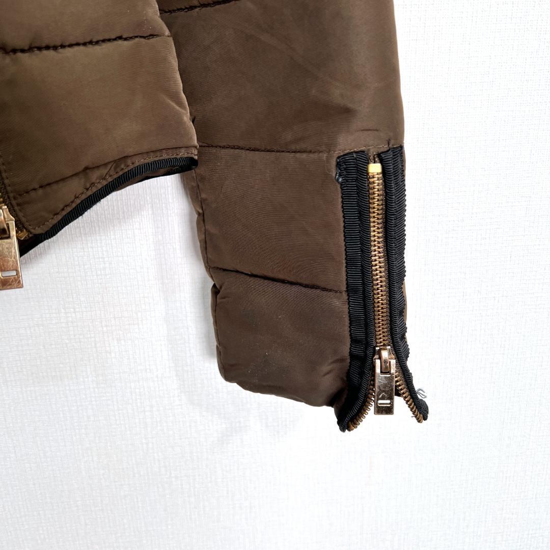 女性用のブラウン系の長袖ダウンジャケットです。襟元のジッパーを外すと中からフードが出てくるデザインです。写真にもありますが、両袖に使用感があり、一部取れています。