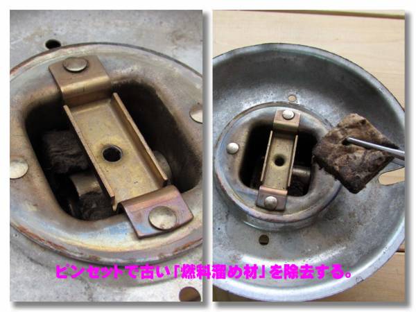そのような場合はバーナーボックス内部に有るこの「燃料溜め材」が劣化、硬化している為に液体状態でジェネレーターから噴出したガソリン燃料が気化せずにオーバーフローして燃料漏れを起こしているかと思います。このパーツを交換してお試し下さい!
