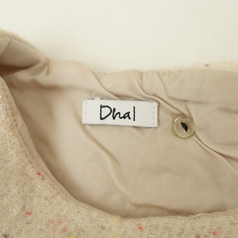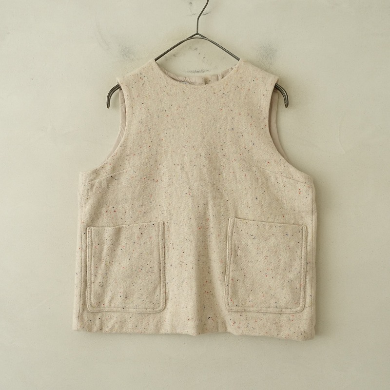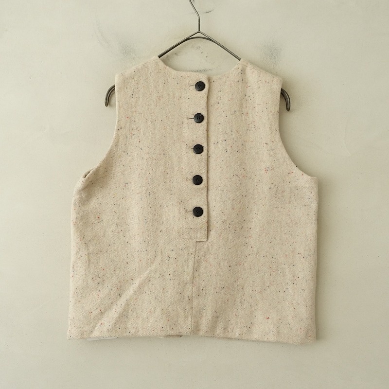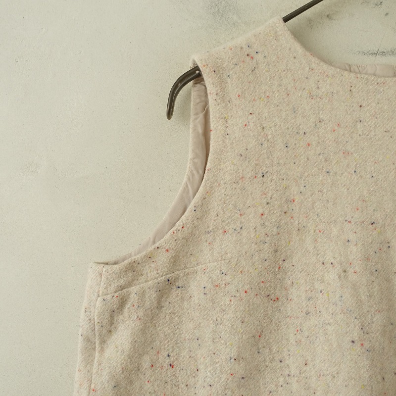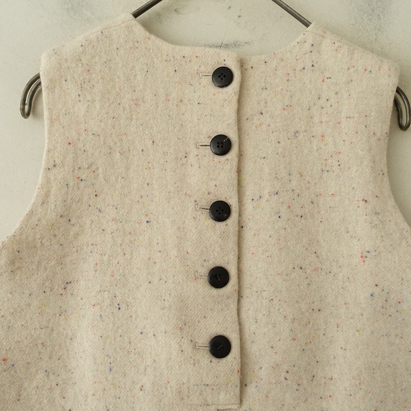 | Dhalのウール混ベストです。カラーはライトベージュ・オレンジ・ブルーなど、起毛がかった素材で、背半開ボタンです。前両腰にポケットがあり、裏地付きです。 |