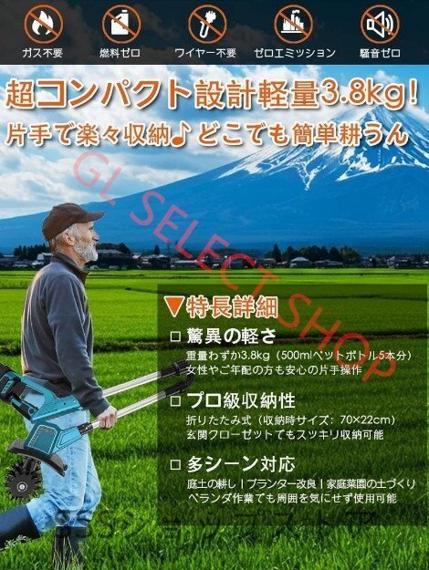 使いやすさに配慮した設計で、女性や田舎暮らしを始める定年後の方に最適。エンジン式よりも音や排気ガスが出ないので、住宅地の庭でも安心して使える。燃料やオイル交換不要でメンテ簡単。家庭菜園、農園、ビニールハウス、ガーデンなどで土を掘る作業に役立つ。電源がない場所や延長ケーブルが足りない現場でも便利。充電式なので、どこでも持ち運べます!