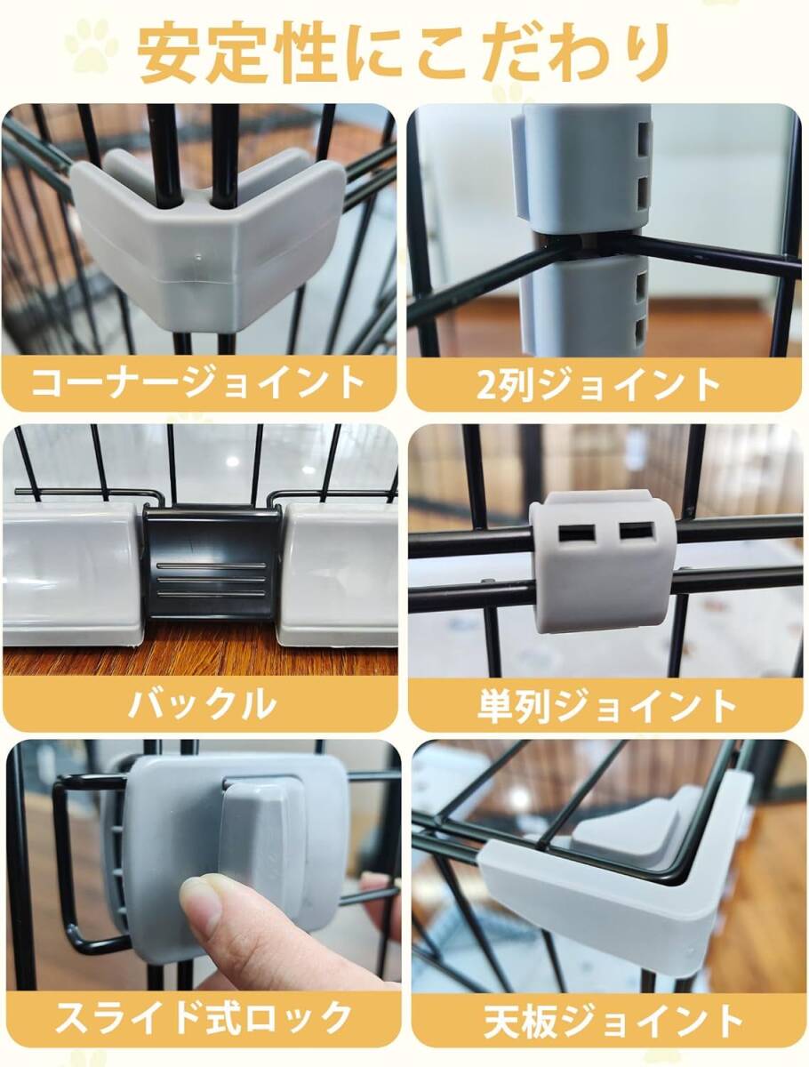 【ロック機能付き】愛猫の脱走が心配な方には、ロック機能付きで柵の間隔が小さいものをおすすめします。子猫や小型の猫は、柵の間から頭を出してしまうことがあります。当社の猫ケージは3センチ間隔の柵を採用しており、子猫や小型の猫が怪我をしないよう配慮しています。また、猫の成長に合わせて棚板の高さも自由に調節できます。