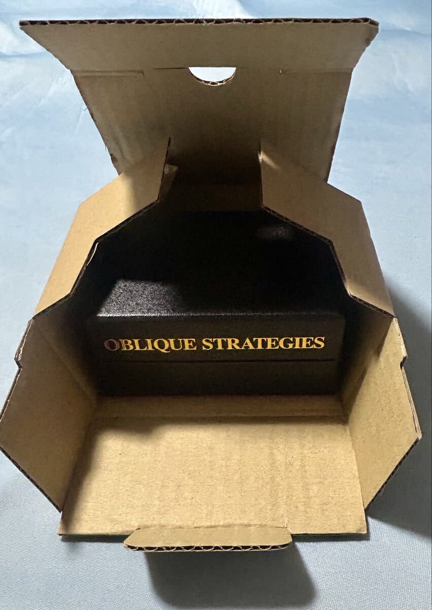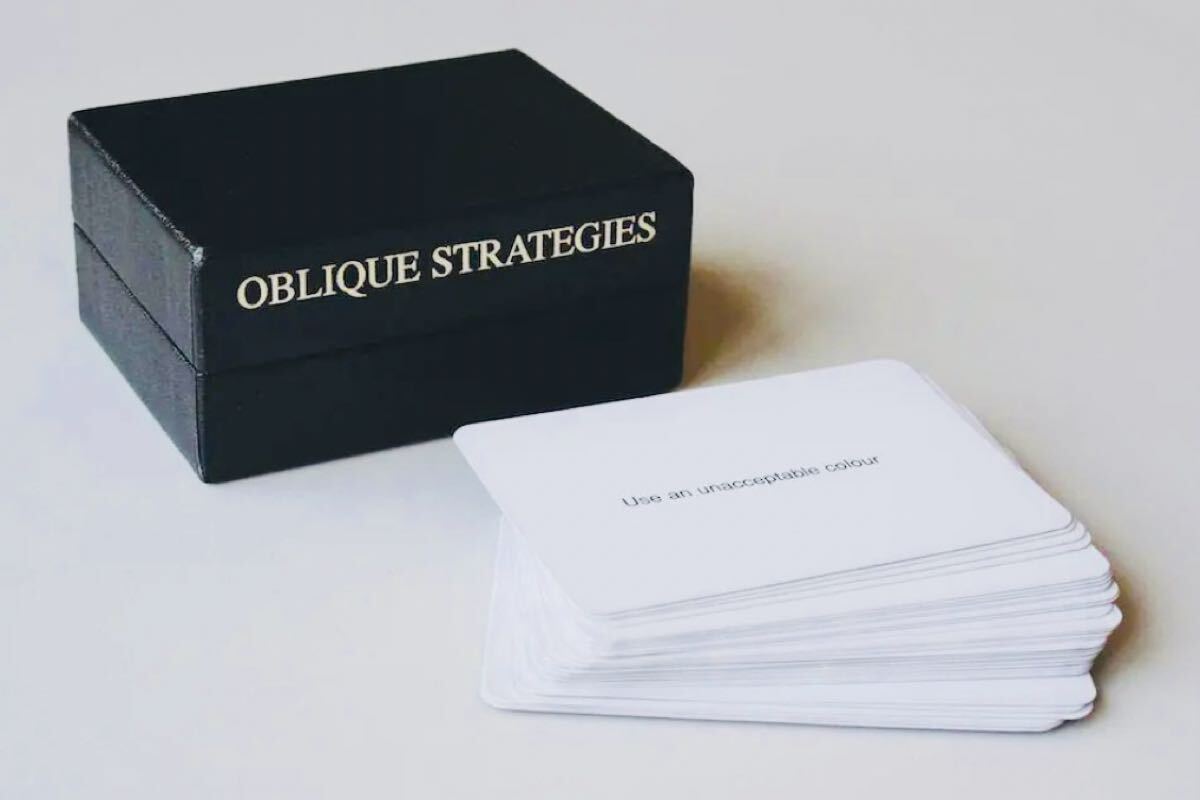 1975年、ピーター・シュミットとブライアン・イーノは、アーティストとミュージシャンとしての自分たちの仕事に対するアプローチを考えながら、オブリーク・ストラテジーズのオリジナルパックを作成しました。オブリーク・ストラテジーズは、クリエイティブな状況を支援するための行動や思考のコースを提案する、100枚以上のカードのセットです。これらの有名なカードは、初版発行以来、世界中の多くのアーティストやクリエイティブな人々によって使用されています。第5版は2001年に発行されました。